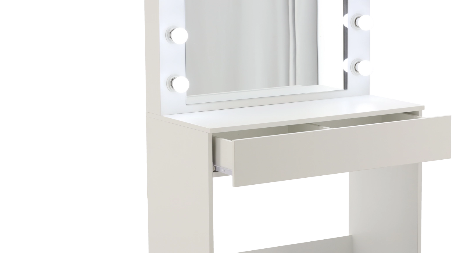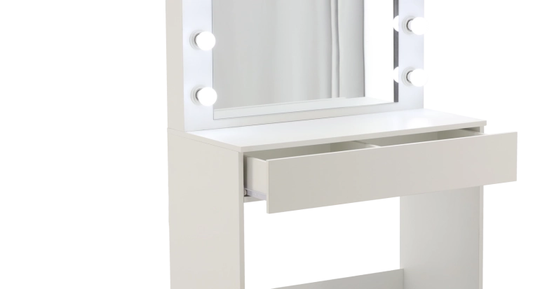 Elegantní bílá toaletka s osvětleným zrcadlem přináší profesionální podmínky pro make‑up, hairstyling i každodenní péči o pleť. Díky 12 LED žárovkám v chladné barvě světla (10 000 K) uvidíte každý detail dokonale a bez barevných zkreslení. Široká deska poskytne místo pro oblíbené produkty, dekorace i drobné doplňky.