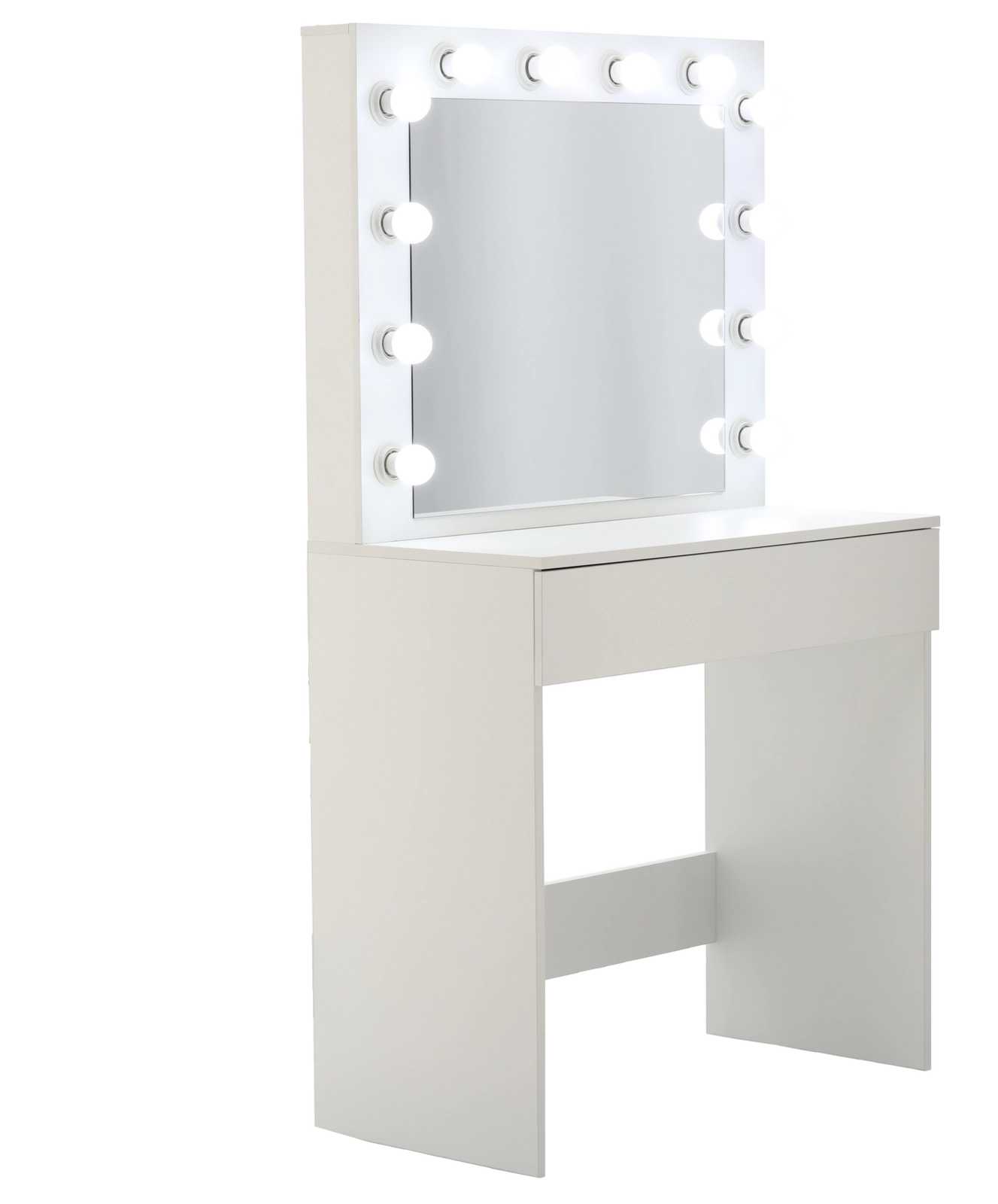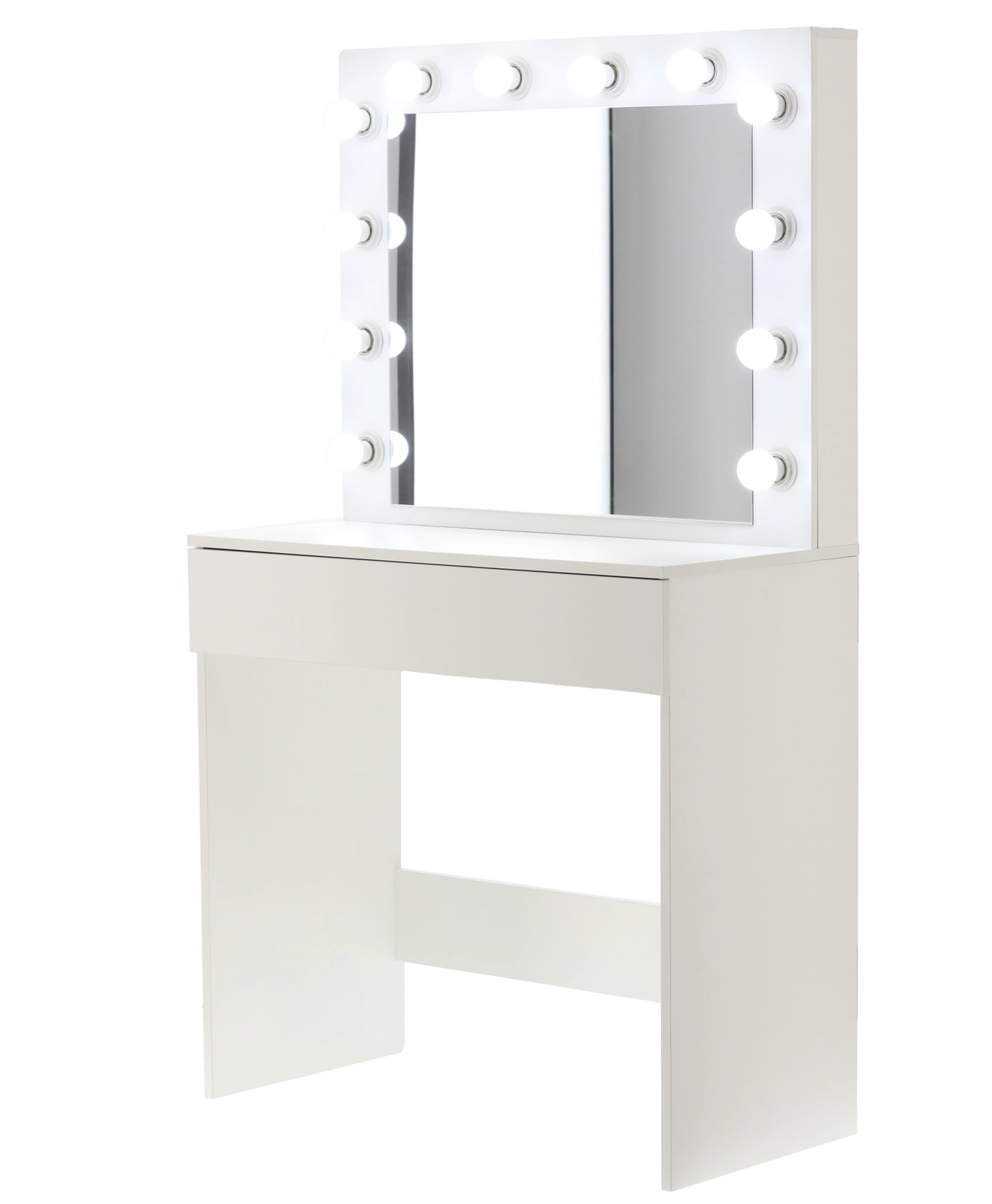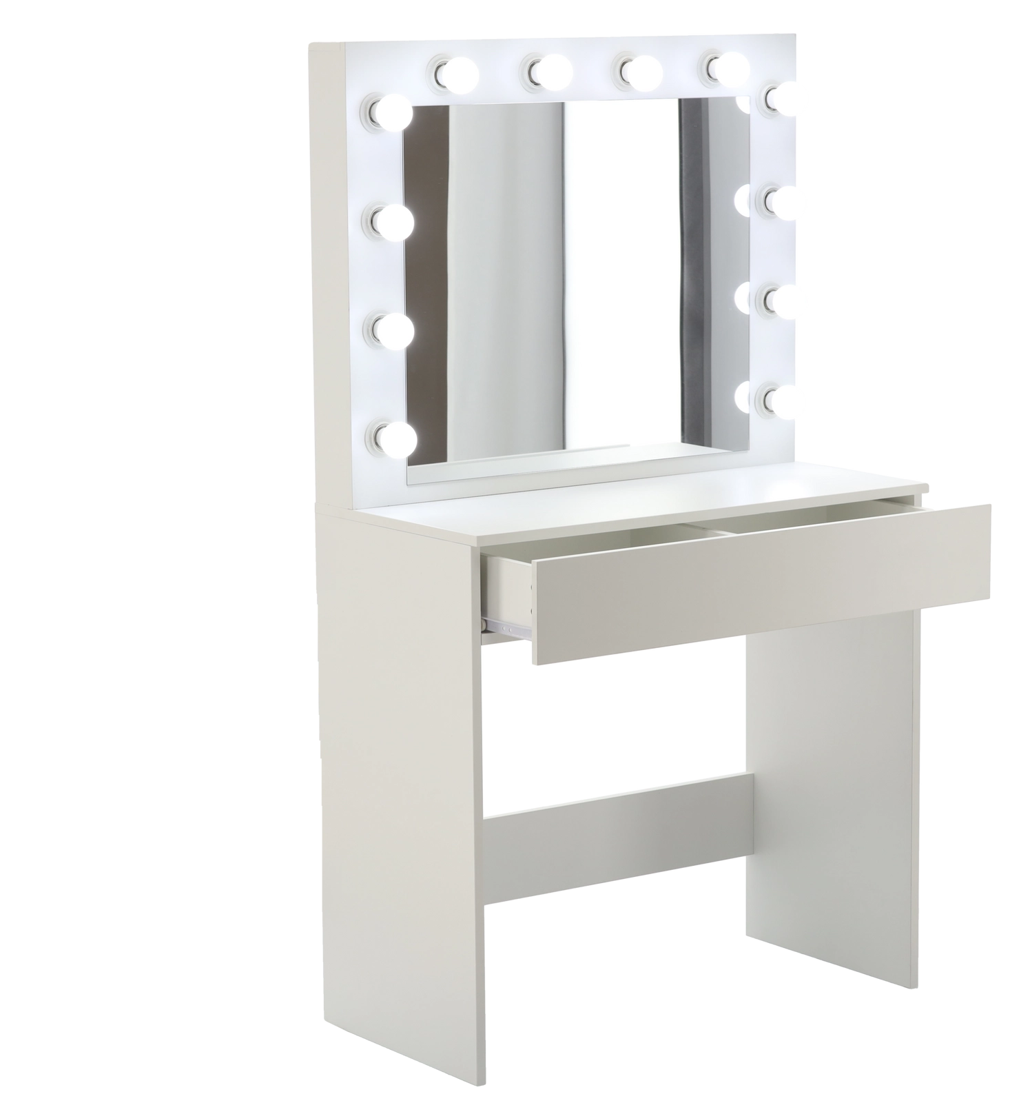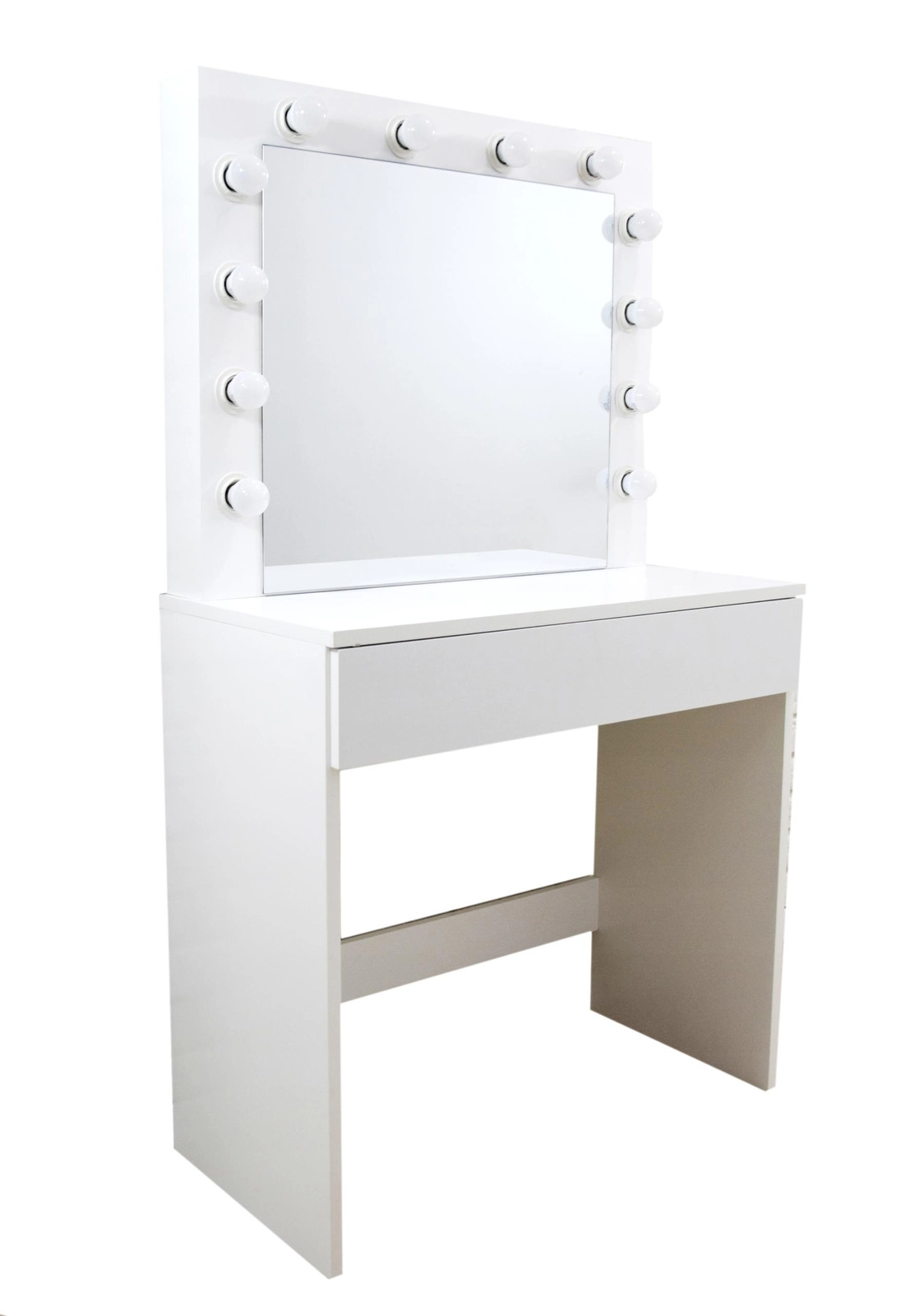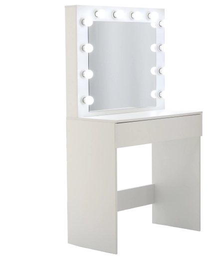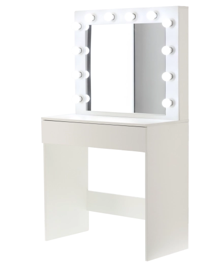 Proměňte svůj koutek krásy v místo jako z filmového ateliéru. Tato bílá toaletka s velkým zrcadlem a 12 LED žárovkami nabízí jasné, rovnoměrné osvětlení bez stínů, prostornou zásuvku s organizérem na kosmetiku a šperky a stabilní konstrukci z MDF. Minimalistický, moderní design skvěle doplní ložnici i šatnu.