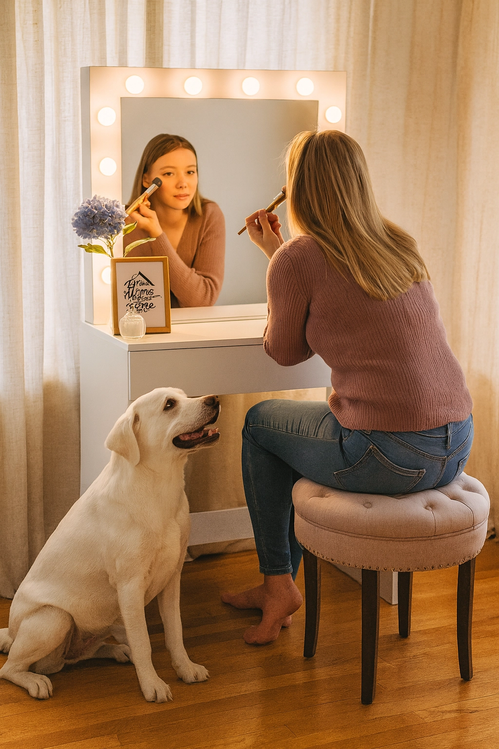 - toaletní stolek + zrcadlo s LED (bez dekorací a doplňků z fotografií)