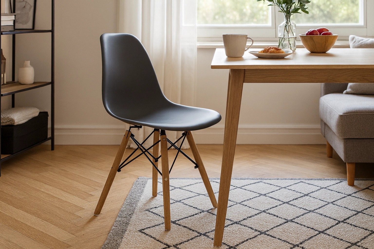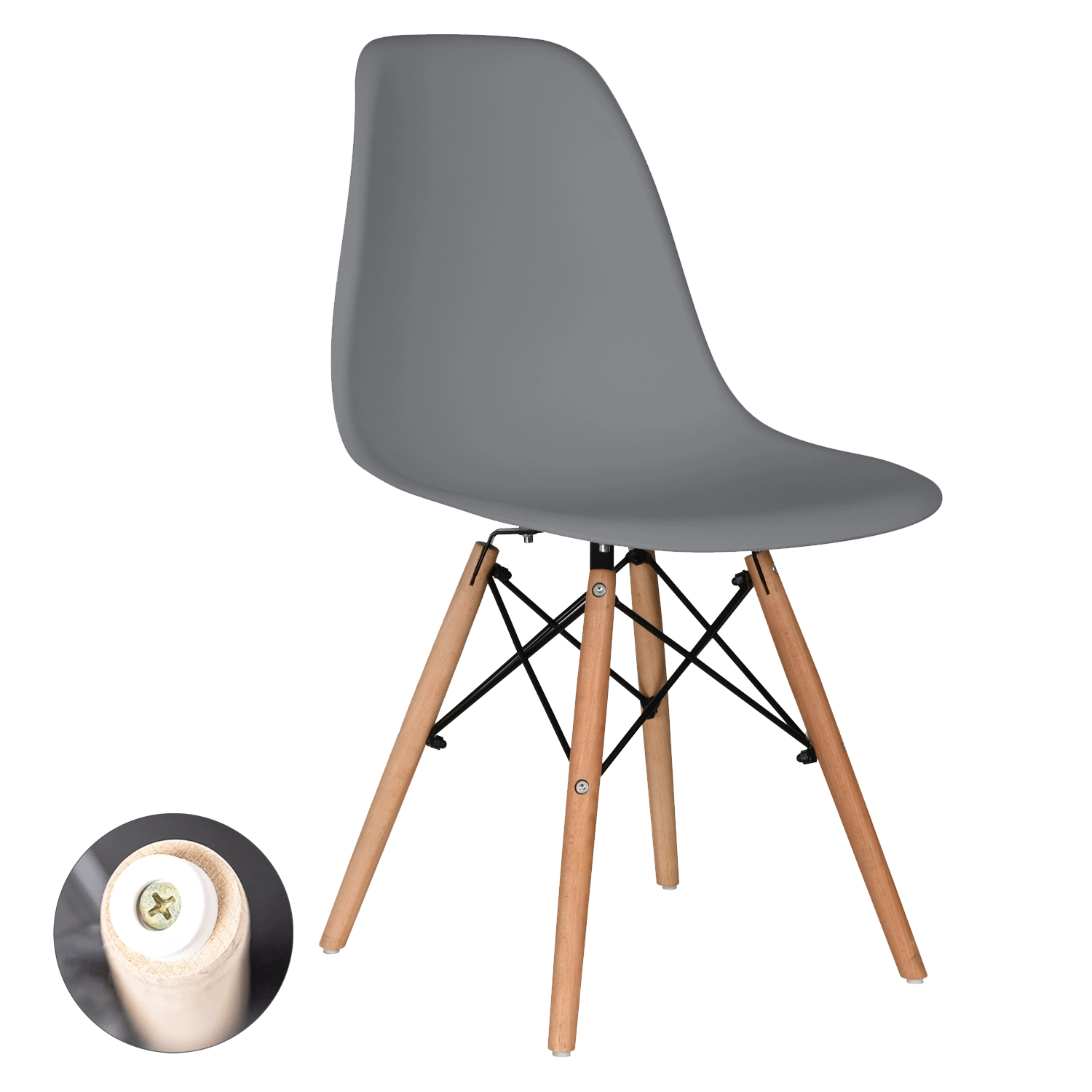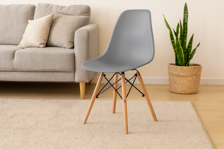 Elegantní šedá židle s tvarovaným plastovým sedákem přináší pohodlí pro každodenní sezení a nadčasový vzhled do každého interiéru – od skandinávského stylu po moderní loft. Dřevěné bukové nohy v teplém odstínu a černé kovové výztuhy dodávají stabilitu a vizuální kontrast.