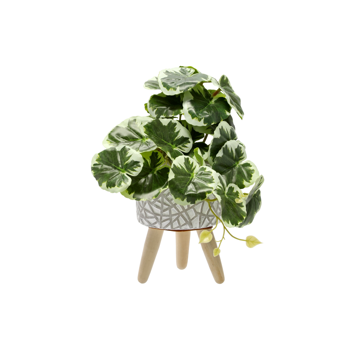 Stylová a minimalistická dekorace pro moderní interiéry. Umělá rostlina o výšce 20 cm s realistickými dvoubarevnými listy a elegantním květináčem na dřevěných nožkách dodá domovu i kanceláři svěží vzhled bez starostí o péči.