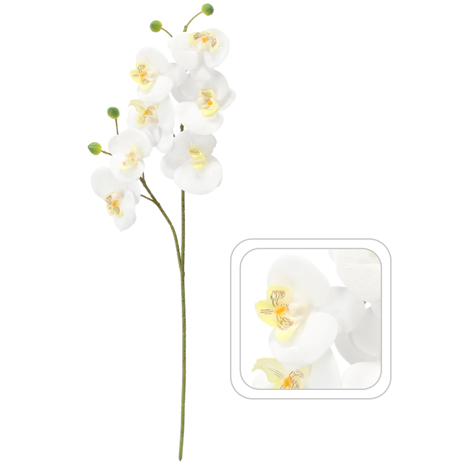 Vneste do prostoru nadčasovou krásu s umělou větví orchideje v bílé barvě. Realistické květy a detailní provedení vytvářejí dojem čerstvě rozkvetlé rostliny, která však nevyžaduje žádnou údržbu. Perfektní volba pro moderní i klasické interiéry, svatby, recepce či sezónní dekorace.