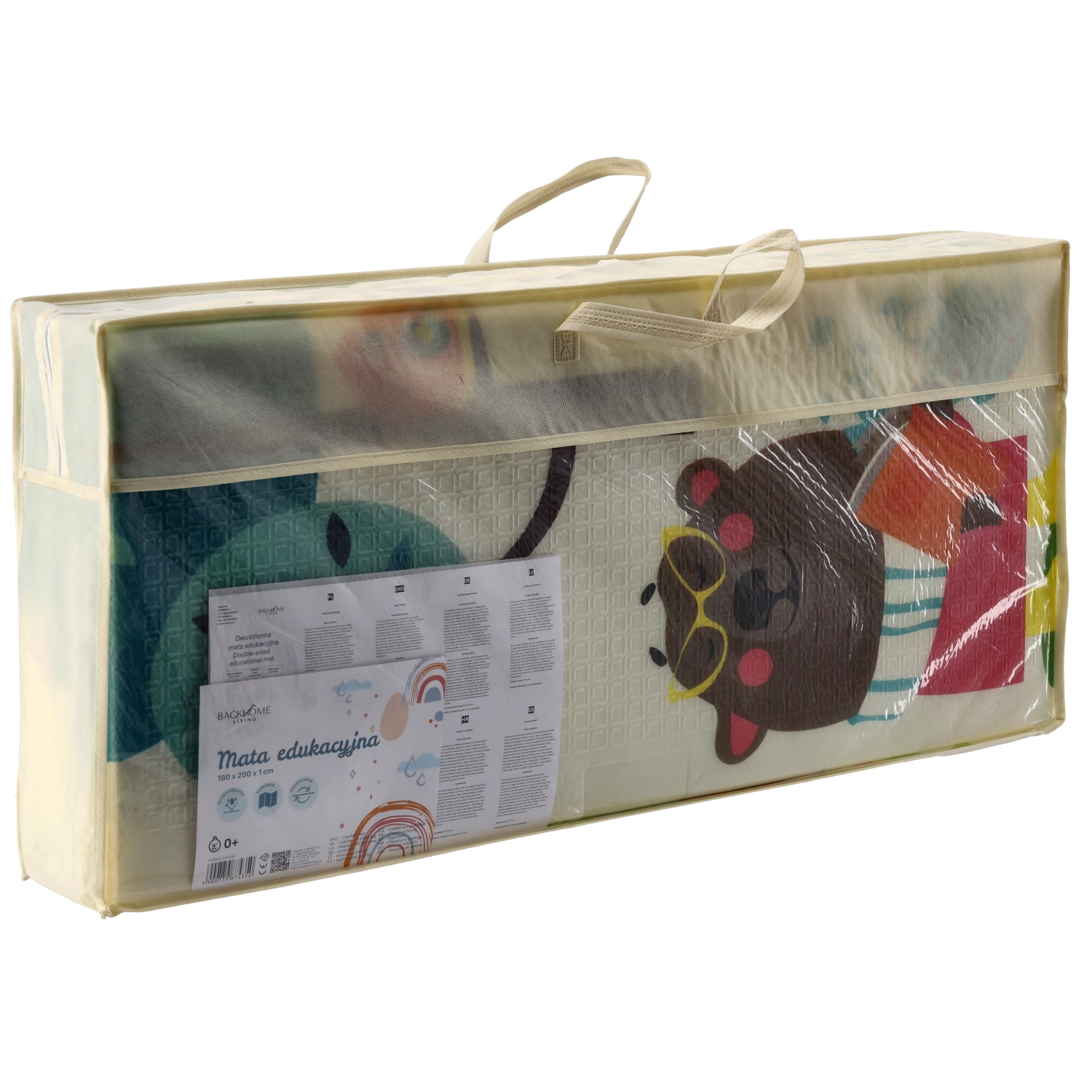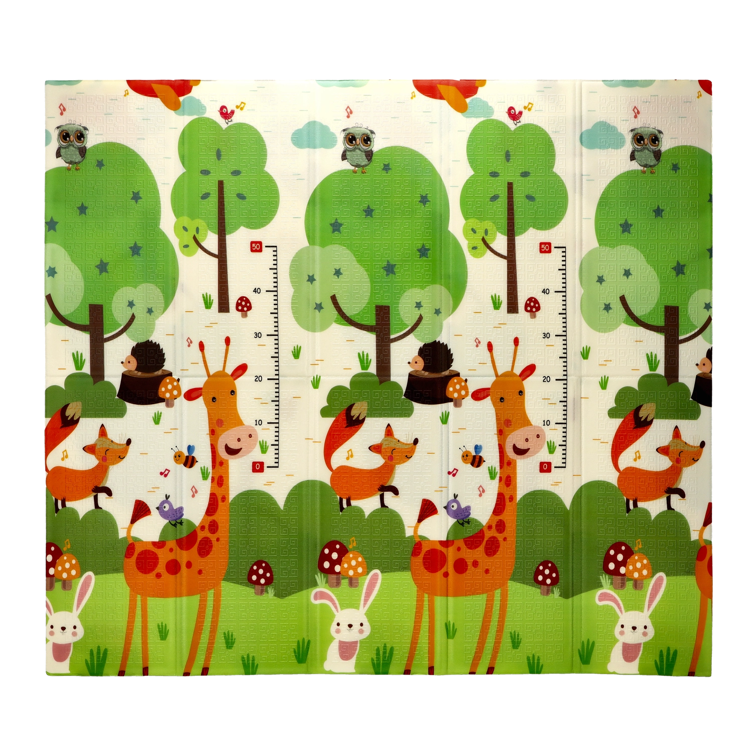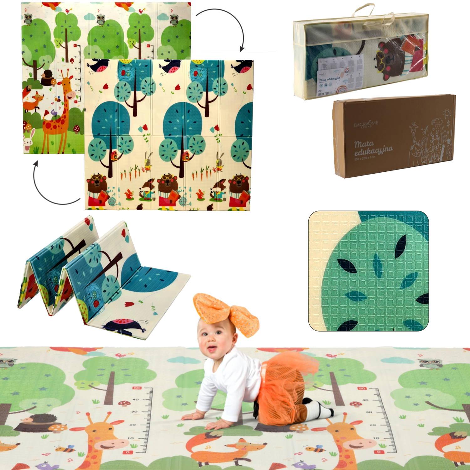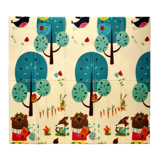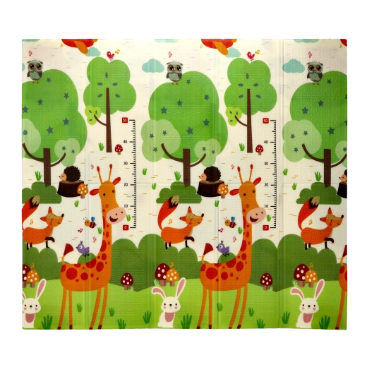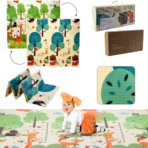 Oboustranné motivy se zvířaty a stromy přirozeně podporují smyslový rozvoj, učení barev a tvarů a inspirují k hravým aktivitám. Podložka se snadno čistí, neabsorbuje vlhkost a poskytuje stabilní, protiskluzový povrch.