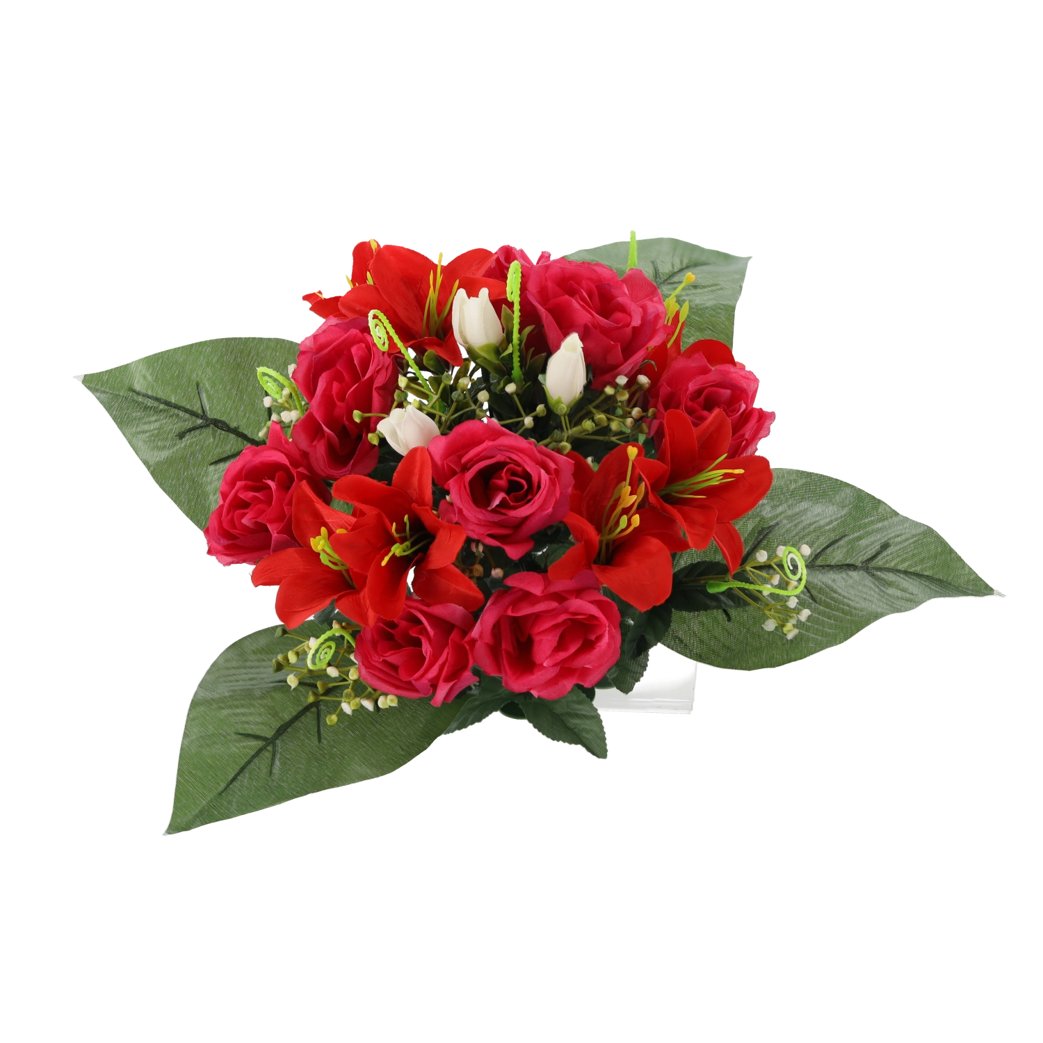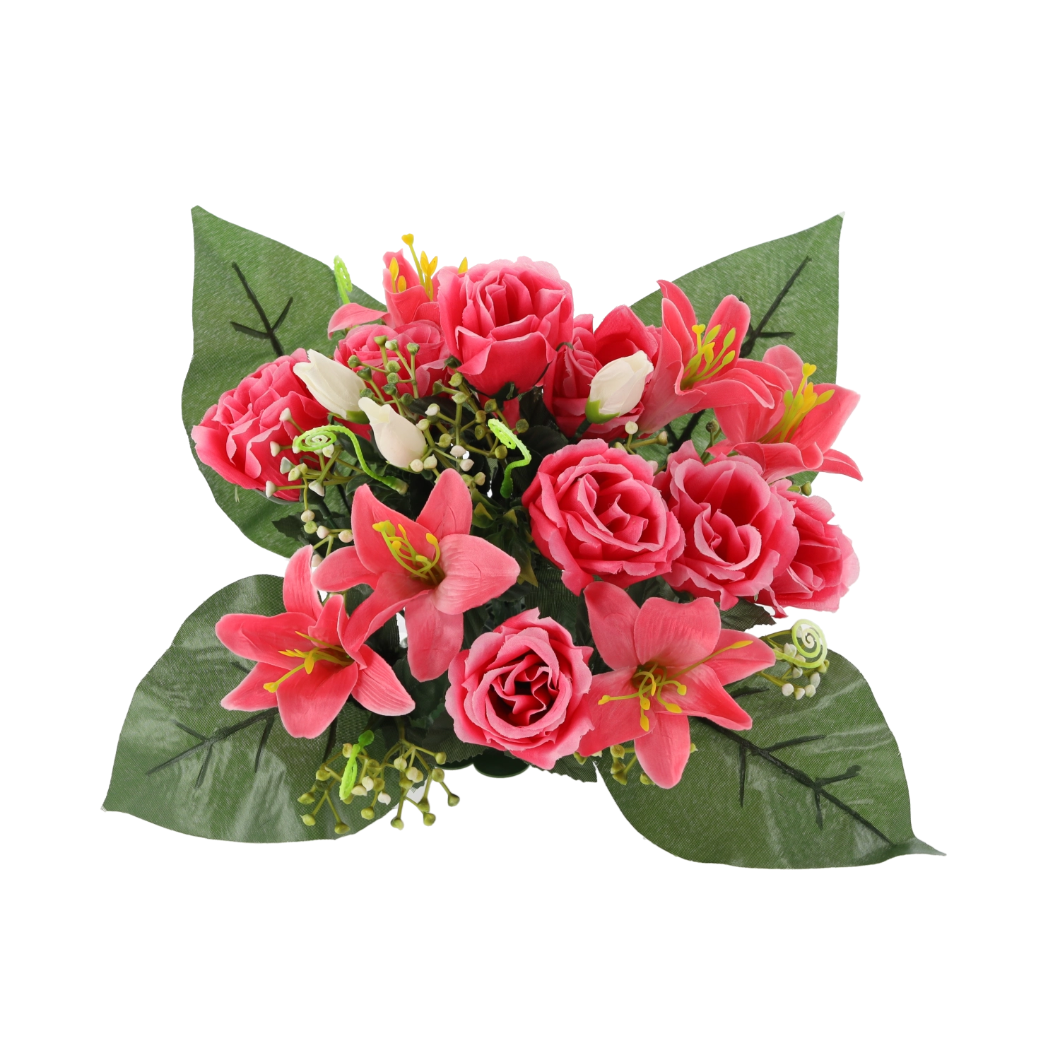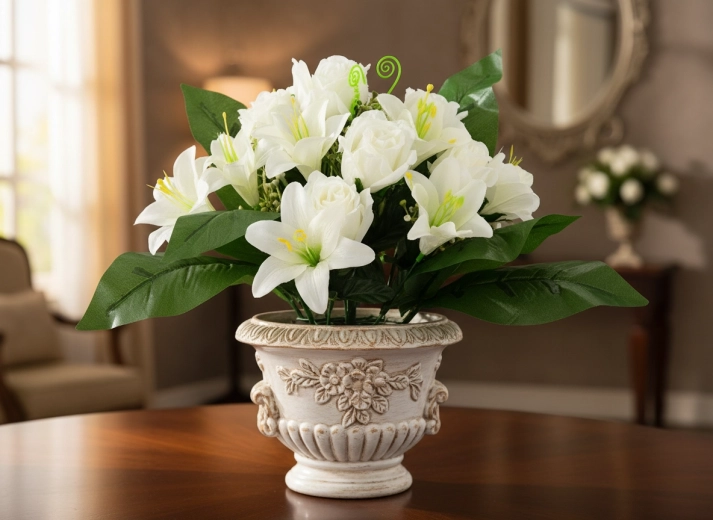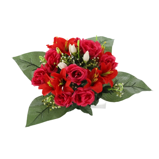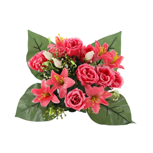 Tato stylová umělá květinová aranžmá spojuje nadčasovou krásu růží a lilií s bohatou zelení pro přirozený vzhled. Díky kompaktním rozměrům 25 × 27 × 27 cm se snadno vejde na stůl, komodu i okenní parapet a okamžitě dodá prostoru svěží a upravený dojem.
