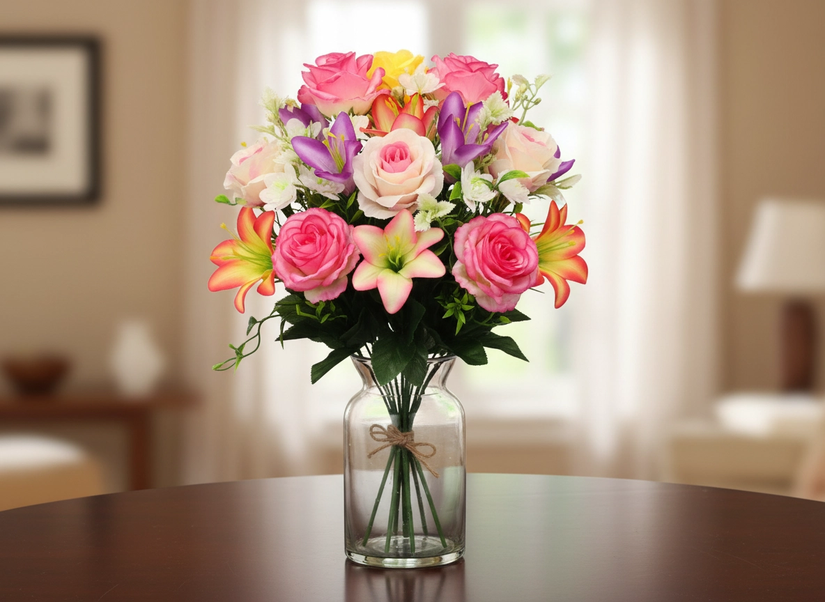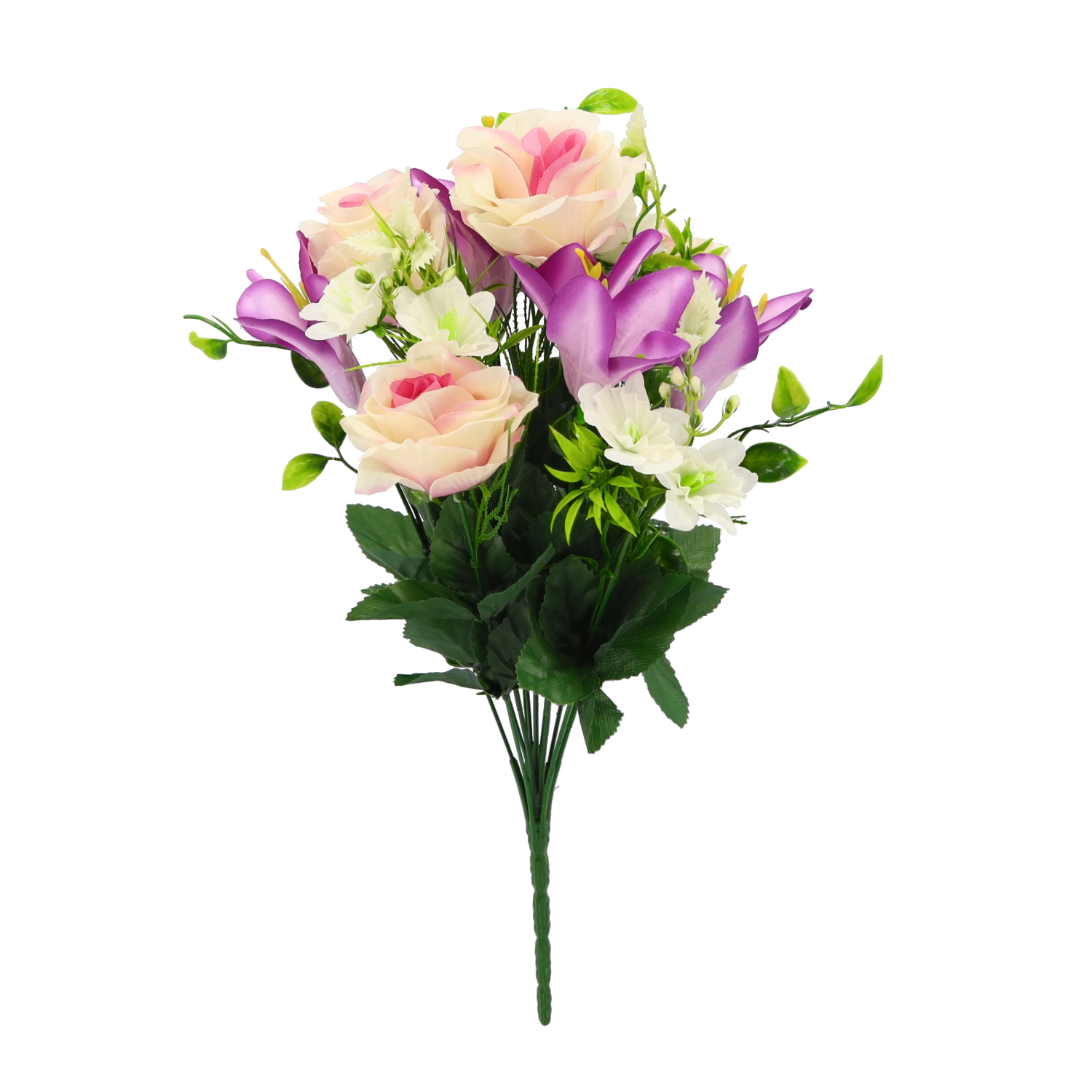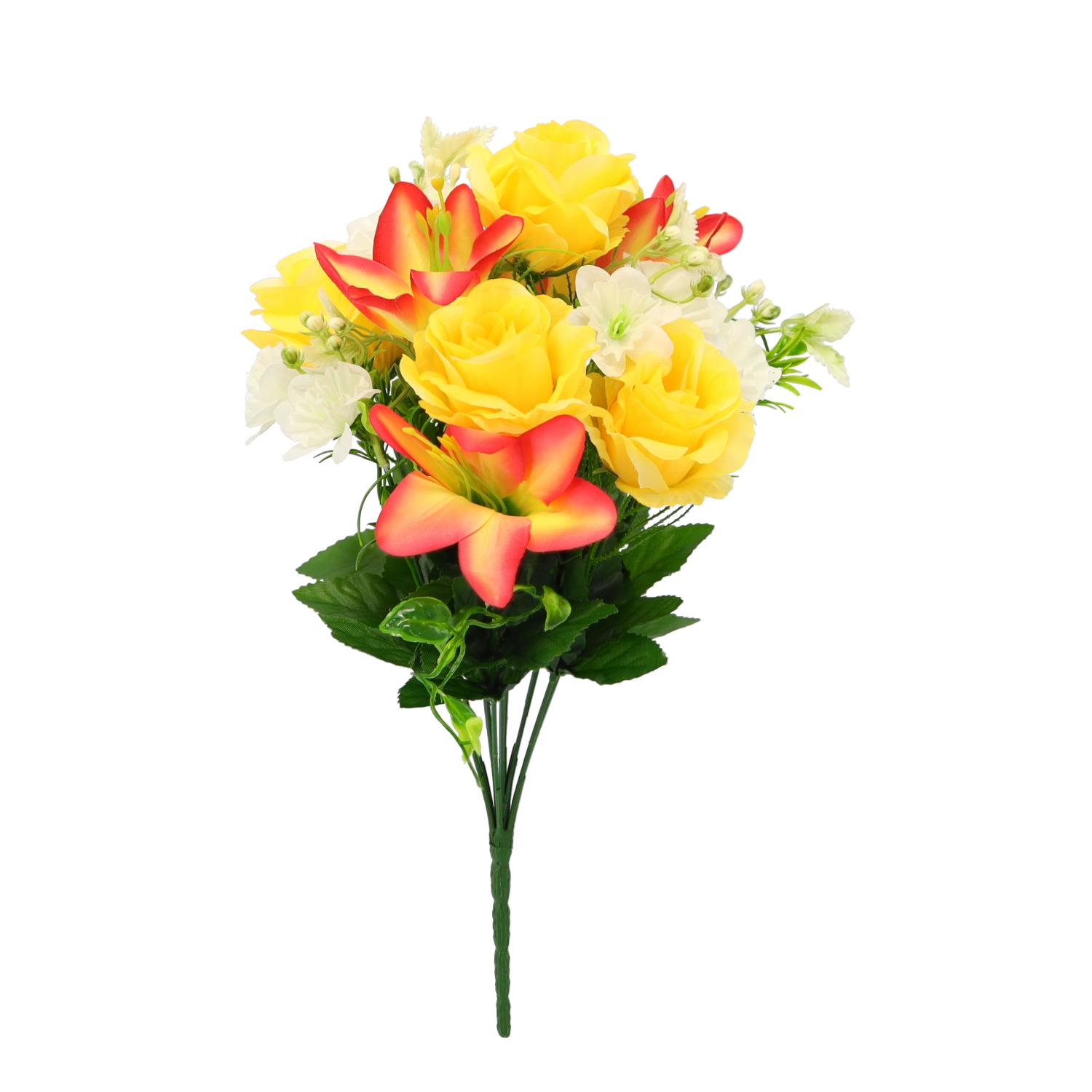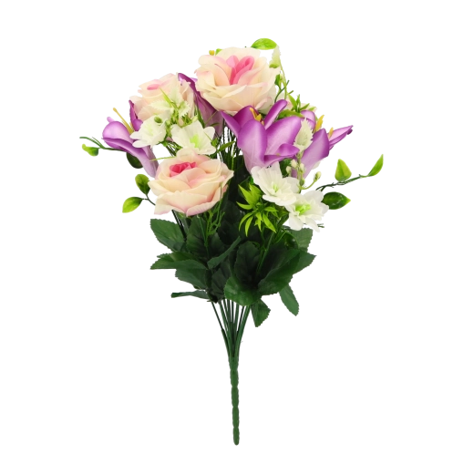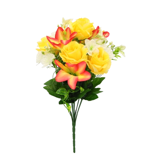 Stylová umělá kytice, která spojuje klasické růže a elegantní lilie s bohatou zelení. Díky rozměrům 43 × 25 × 25 cm a provedení v mixu barev působí přirozeně a svěže po celý rok. Realistické detaily, odolné materiály a nulové nároky na údržbu z ní dělají perfektní dekoraci do obývacího pokoje, ložnice, kanceláře i recepce.