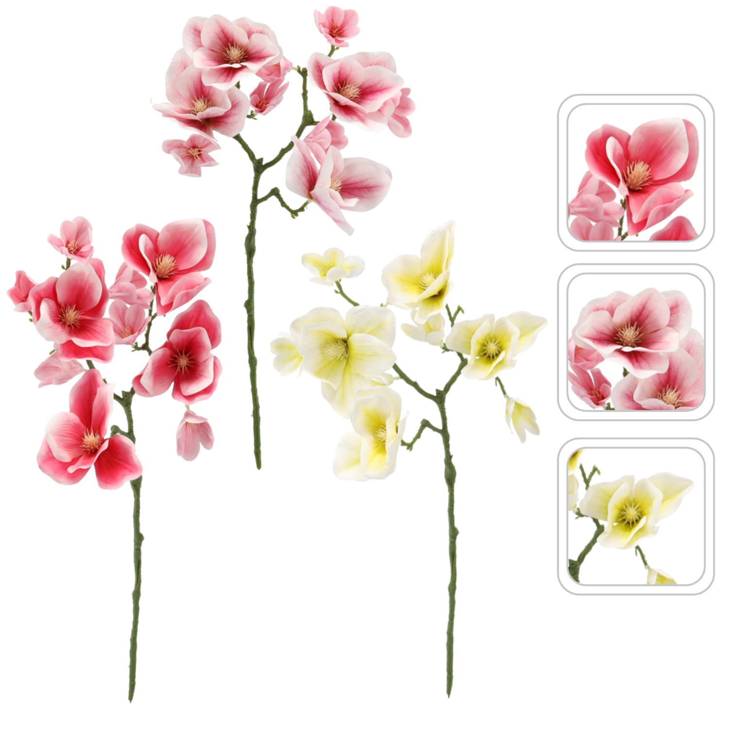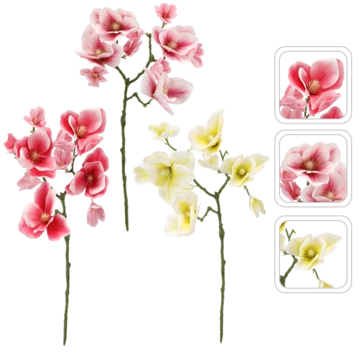 Dekorativní umělá větvička magnolie o výšce 56 cm přinese vašemu interiéru nádech elegance po celý rok. Věrné zpracování květů a listů působí realisticky, nevyžaduje žádnou údržbu a je ideální do váz, aranžmá či jako doplněk svatební a sezónní výzdoby. K dispozici v mixu barev pro snadné sladění s vaším stylem.