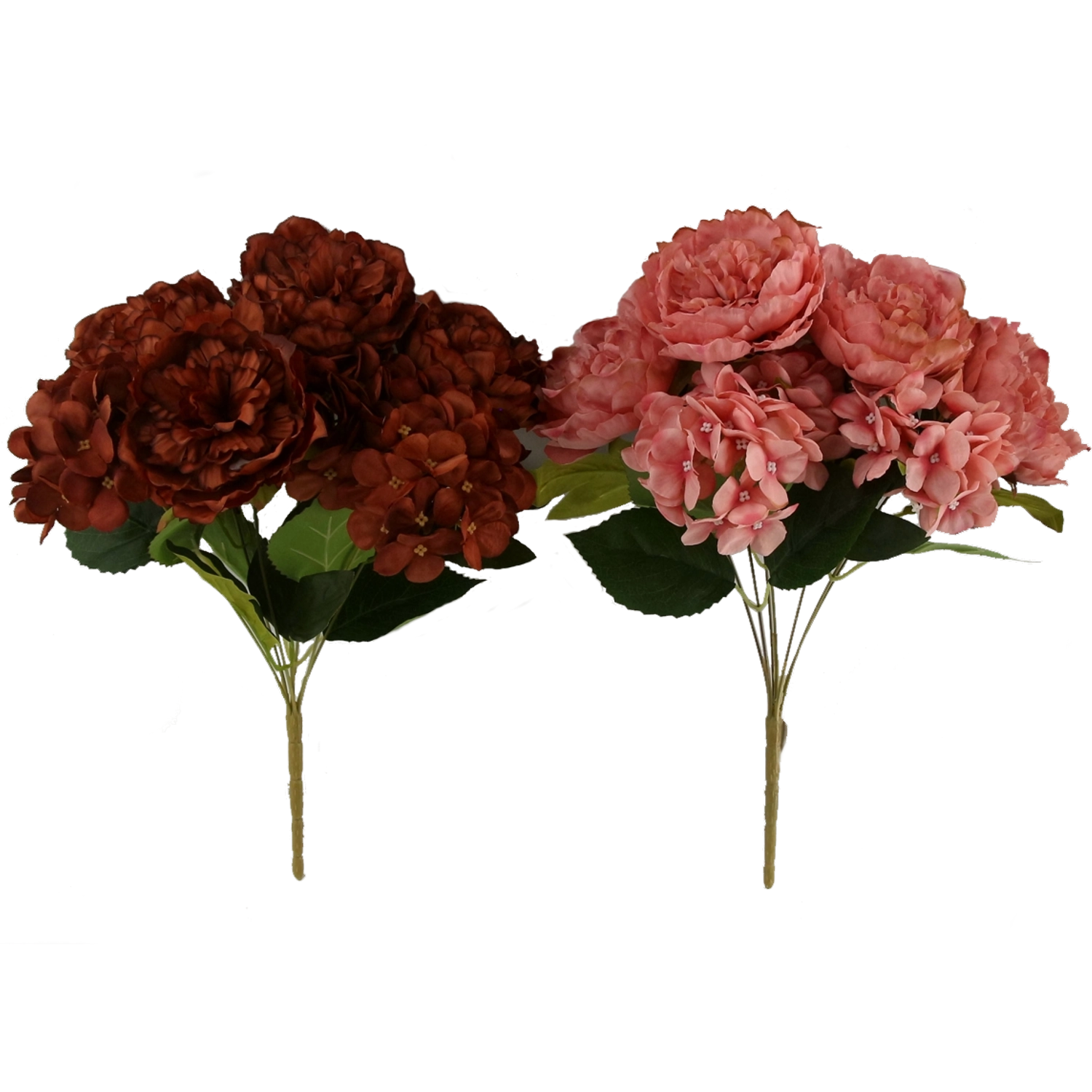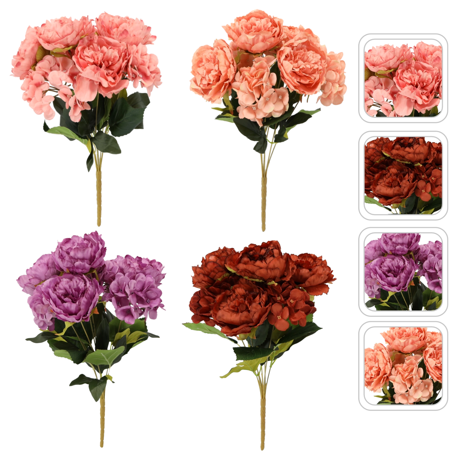 Tato umělá kytice spojuje nadýchané květy pivoněk a bohaté hlavičky hortenzií do harmonického celku. Díky výšce 43 cm se skvěle hodí do menších i středně velkých váz, na stůl, komodu či do dárkových aranžmá. Mix barev přináší přirozený vzhled a snadné sladění s různými styly interiéru.