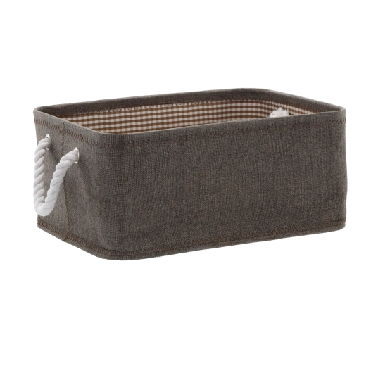 Koš je vyroben z odolné tkaniny pro dlouhou životnost a snadnou údržbu. Silné pletené lanové úchyty umožňují pohodlné přenášení a vnitřní podšívka s dekorem dodává elegantní vzhled. Měkké boky šetří prostor a umožňují snadné uložení na police či do skříně.