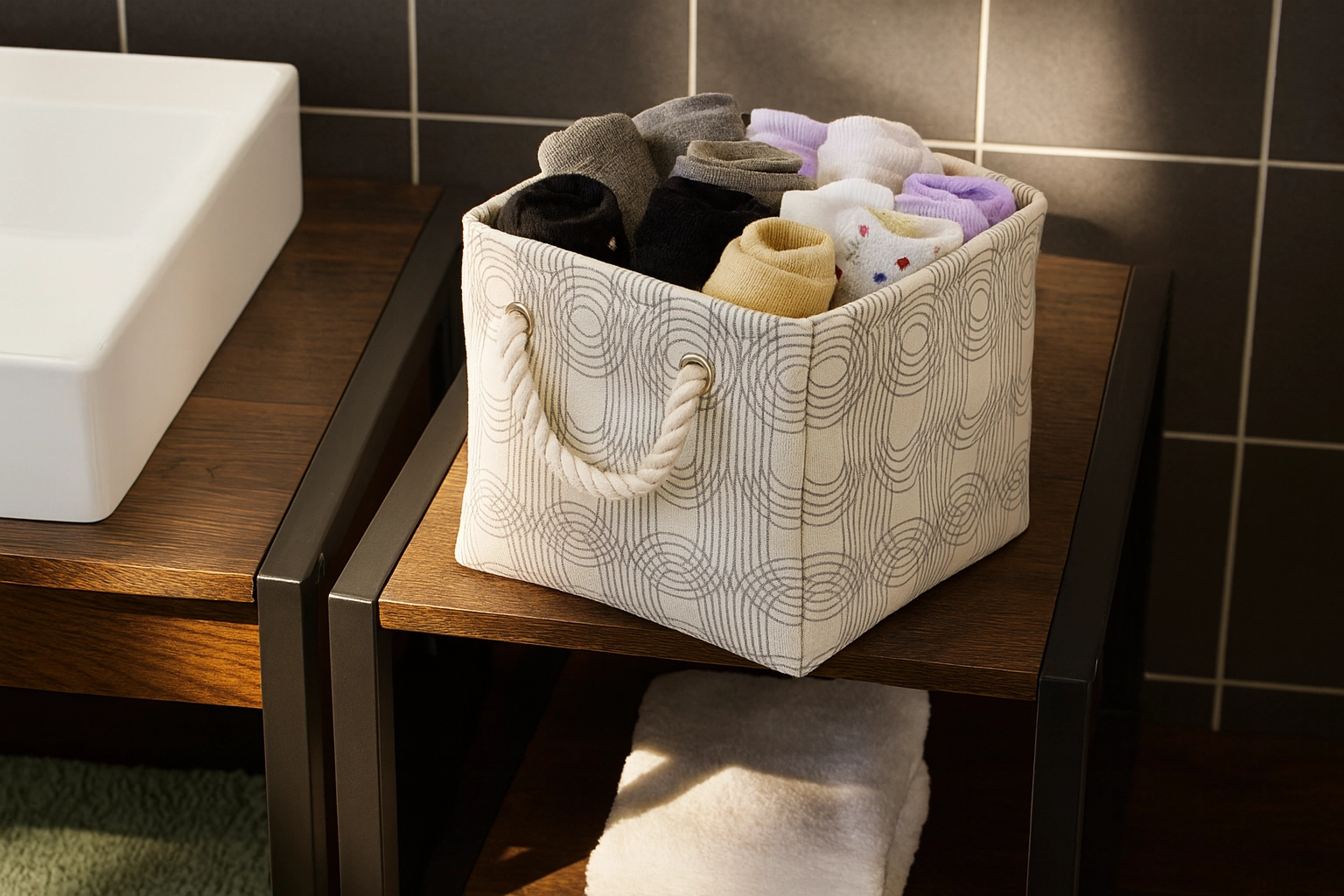 Neutrální béžovo‑šedé tóny a jemný geometrický vzor snadno sladíte s moderním i skandinávským stylem. Koš působí čistě a upraveně na polici, v koupelně i pracovně.