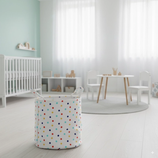Tento kulatý textilní koš s barevnými puntíky je univerzálním pomocníkem do koupelny, dětského pokoje i ložnice. Nabízí dostatek prostoru pro uložení prádla, hraček či domácích drobností a zároveň dodá místnosti svěží, veselý vzhled.