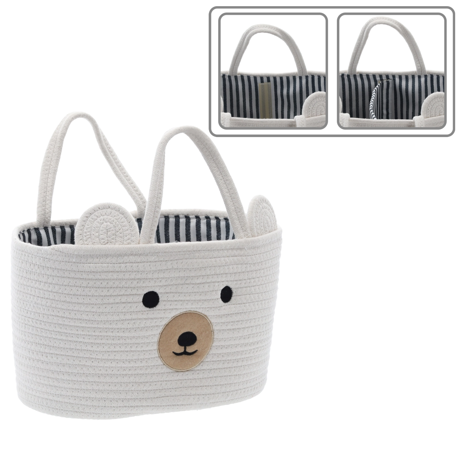 Objevte stylové a bezpečné ukládání s bílým textilním košíkem s oušky a něžným zvířátkovým obličejem. Neutrální barva zapadne do dětského pokoje, ložnice i obývacího prostoru a podtrhne útulnou atmosféru domova. Díky pevným bočnicím a lehké konstrukci zvládne každodenní používání a přenášení.