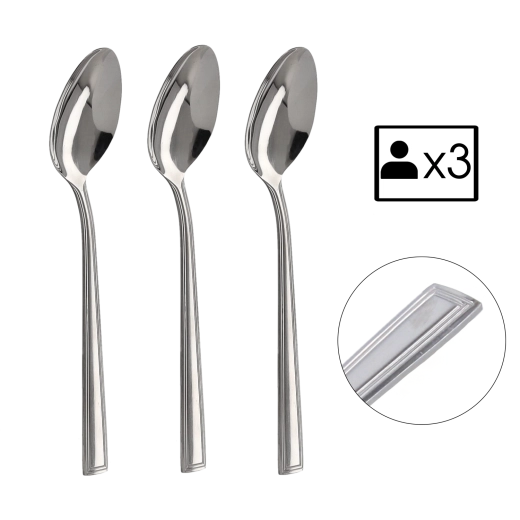 Elegantní sada tří jídelních lžic Milano spojuje nadčasový styl a praktičnost pro každý den i slavnostní tabuli. Lžíce z kvalitního kovu o délce 19,5 cm nabízejí vysokou odolnost, ergonomické držení a snadnou údržbu v myčce. Jemně vzorovaná rukojeť dodává příborům sofistikovaný vzhled a skvěle ladí s různými styly stolního nádobí.