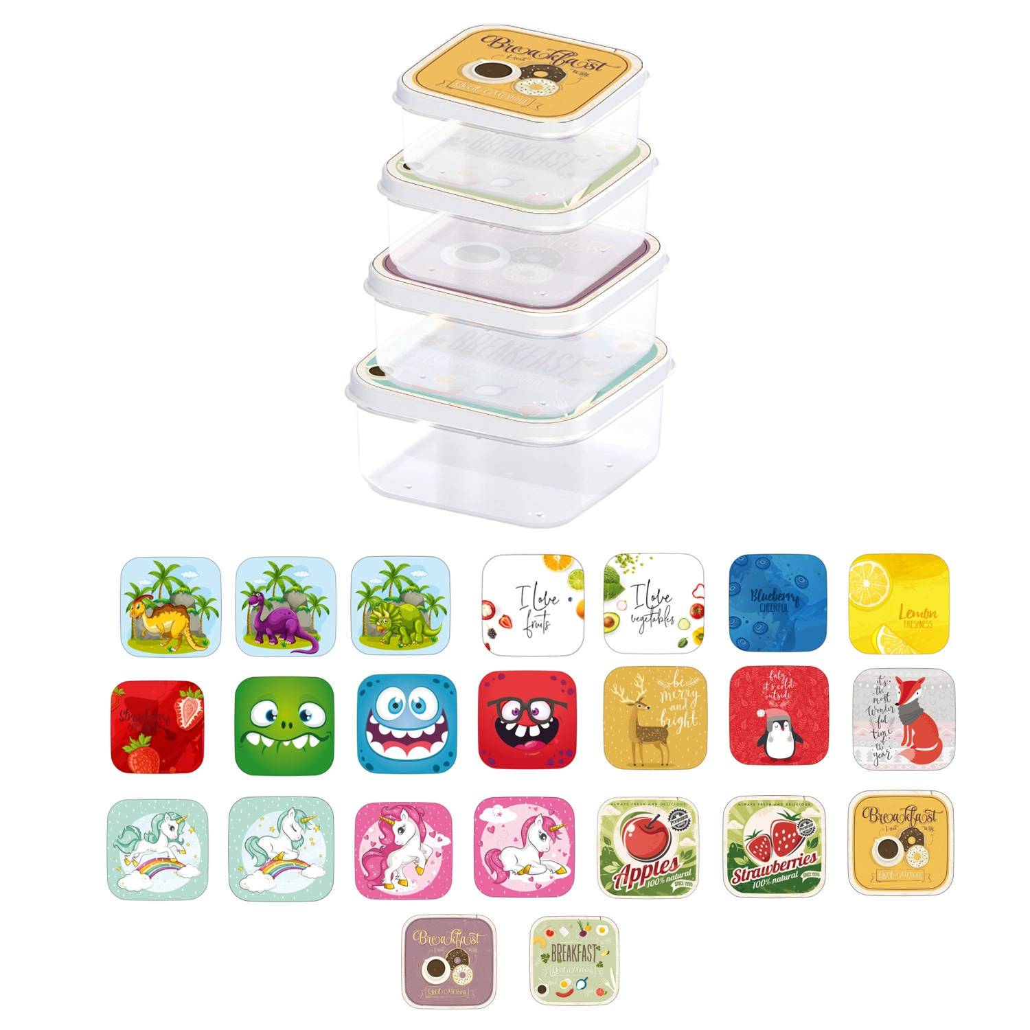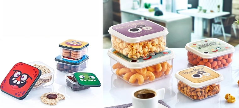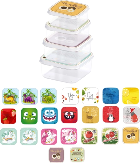 S touto sadou 4 čtvercových dóz budete mít svačiny i menší potraviny vždy přehledně a hygienicky uložené. Dózy jsou z odolného, zdravotně nezávadného plastu vhodného pro potraviny a víčka s veselými motivy motivují děti k samostatnému používání.