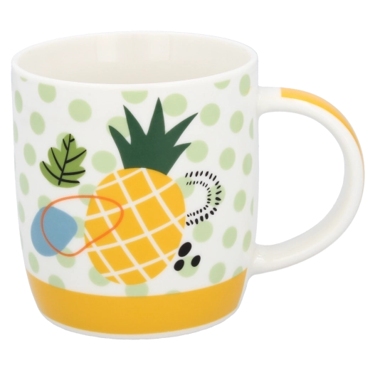 Stylový porcelánový hrnek o objemu 365 ml s motivy ananasu a pomeranče vnese do vaší kuchyně svěžest a energii. Kvalitní porcelán, ergonomické ucho pro pohodlné držení a snadná údržba v myčce dělají z tohoto hrnku praktický i dekorativní kousek pro každodenní používání.