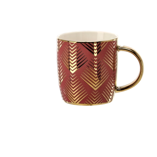 Dopřejte si chvíle pohody s porcelánovým hrnkem, který spojuje elegantní design a praktickou funkčnost. Zlaté akcenty s geometrickým chevron vzorem dodávají prémiový vzhled, zatímco pohodlné držadlo usnadňuje každodenní používání.
