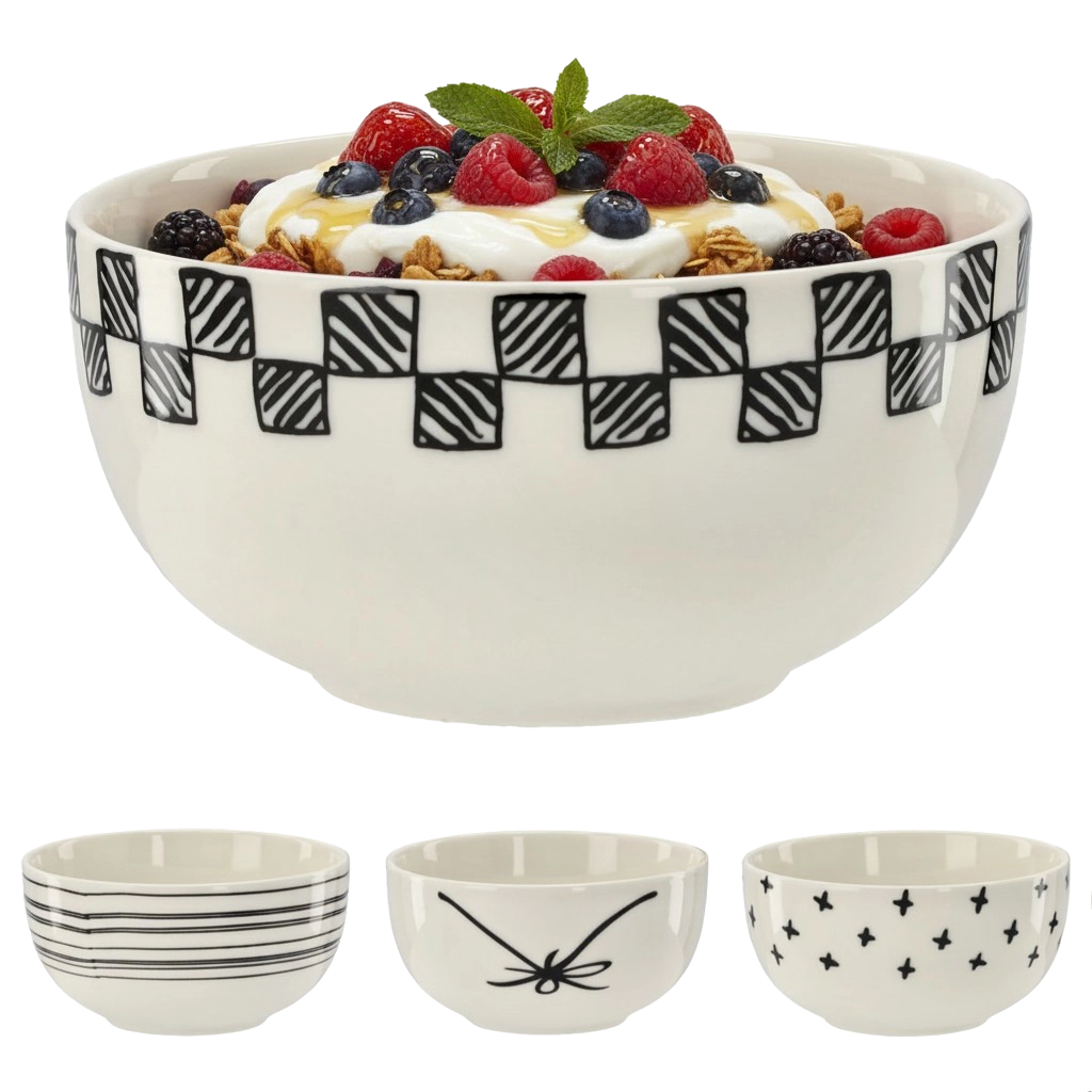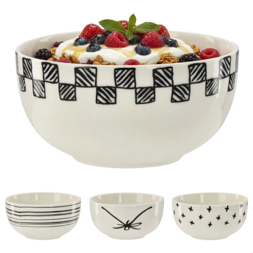 Dopřejte si dokonalé servírování s miskou Black & White o objemu 550 ml. Díky kvalitní keramice a lesklé glazuře se hodí na snídaňové cereálie, polévky, saláty i snacky. Minimalistické černobílé motivy zvýrazní každý stůl a snadno je zkombinujete s dalším nádobím.