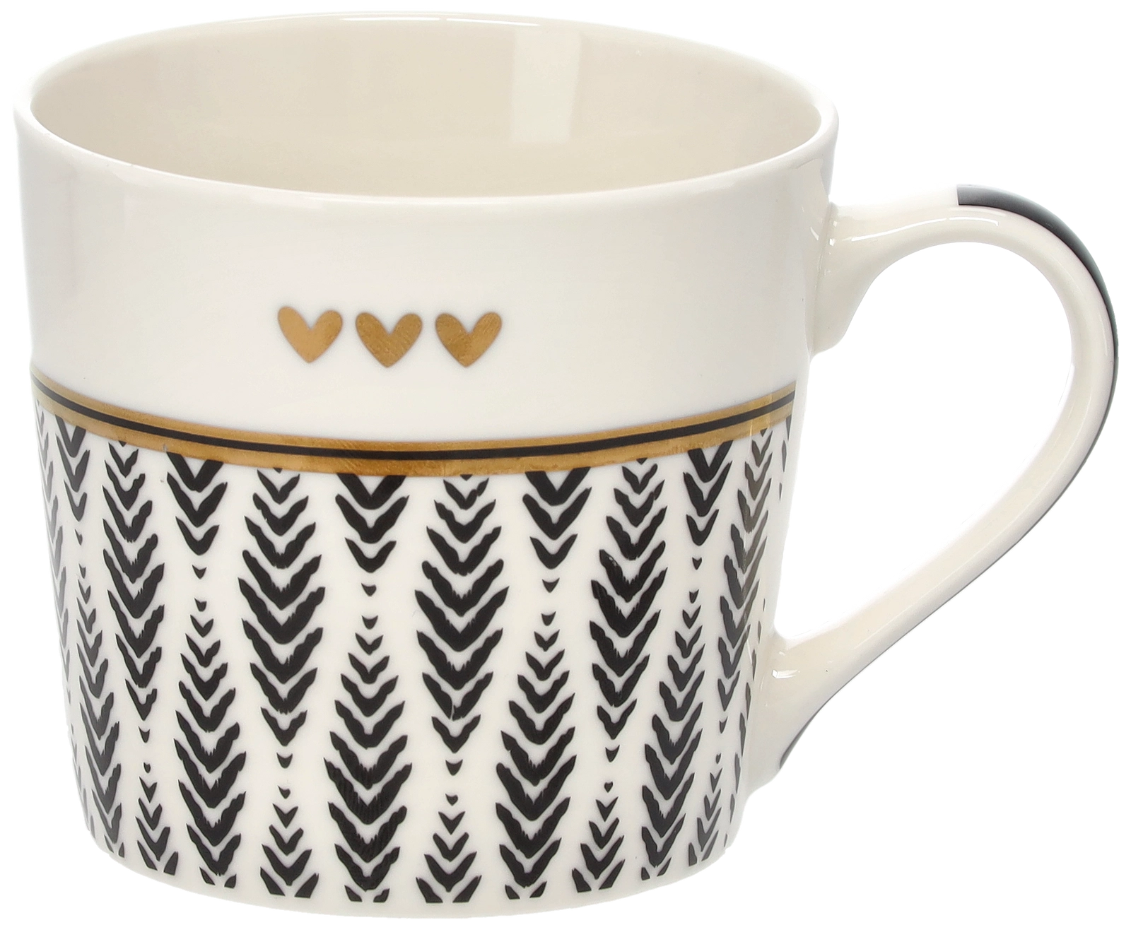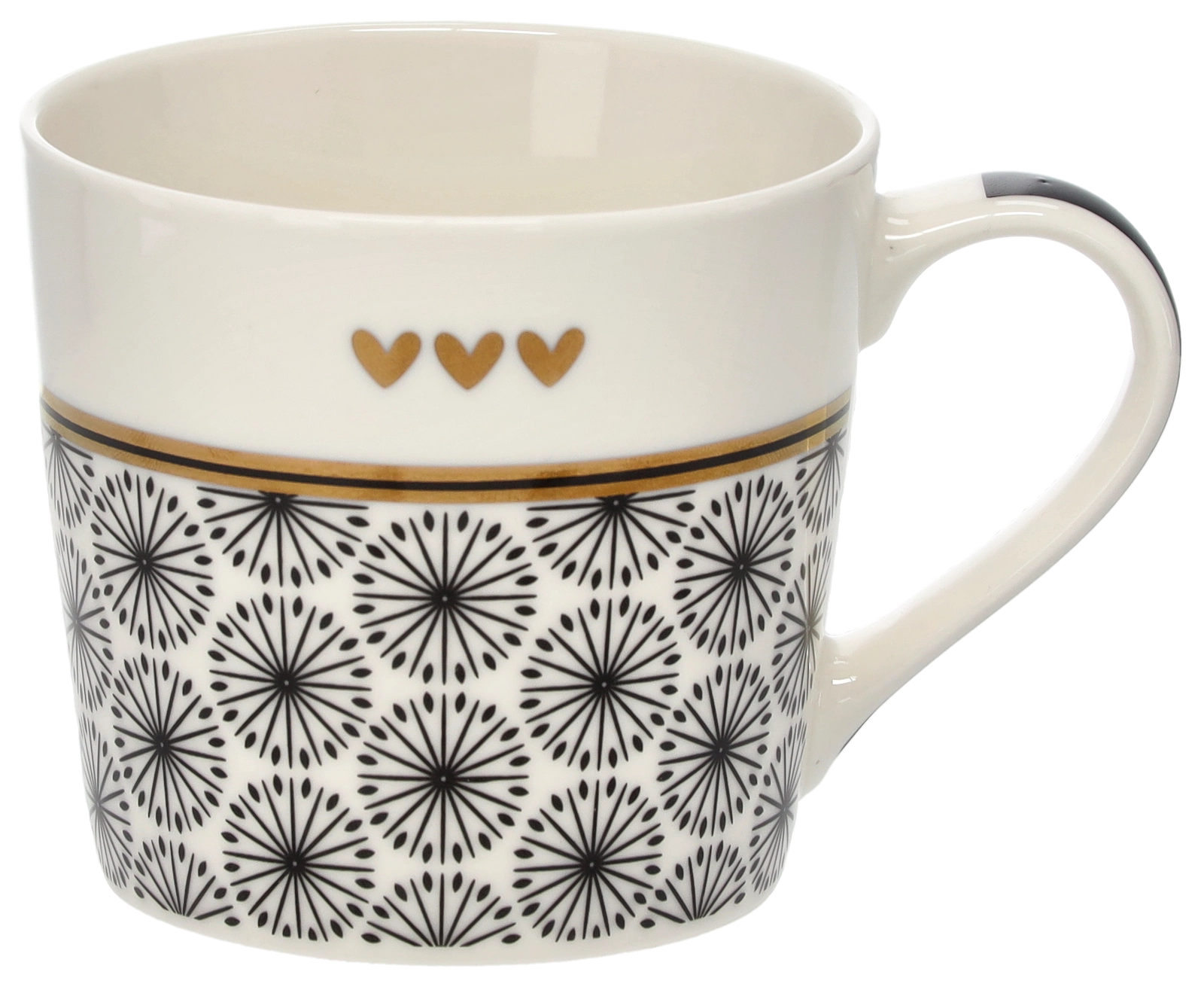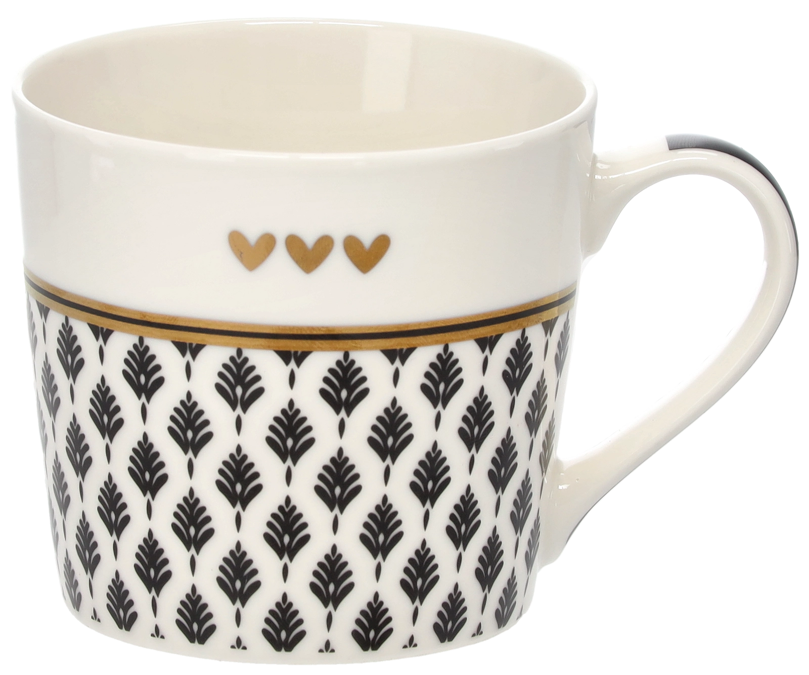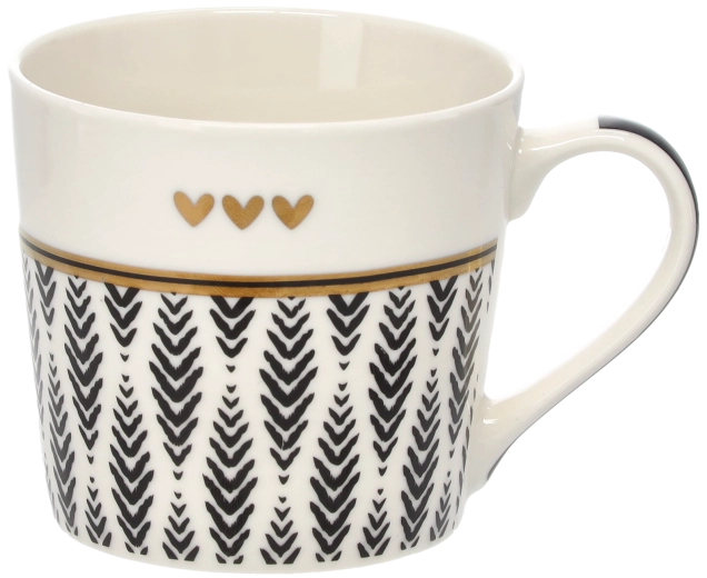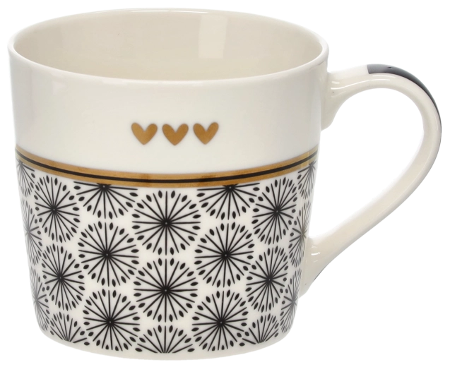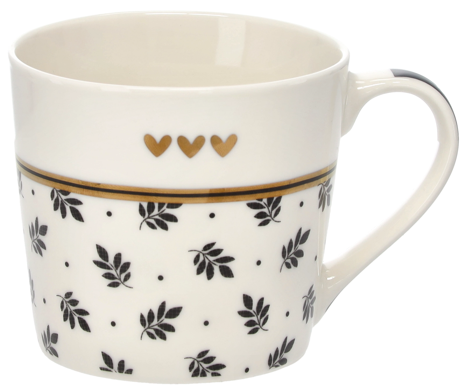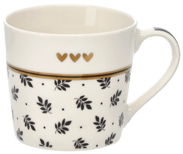 Jemný motiv větviček doplněný třemi malými srdíčky a zlatým proužkem dodává hrnku sofistikovaný vzhled, který vynikne na každém stole.