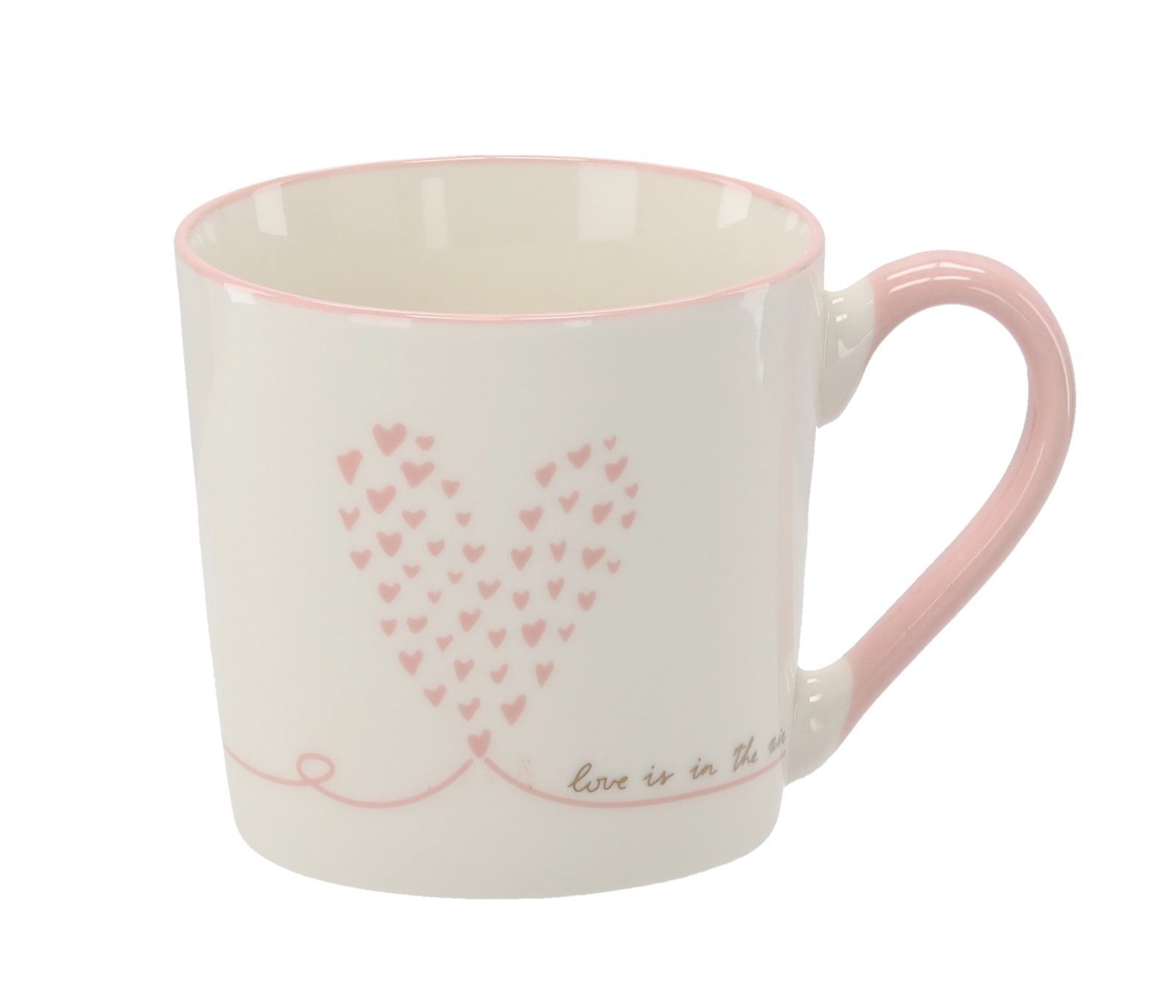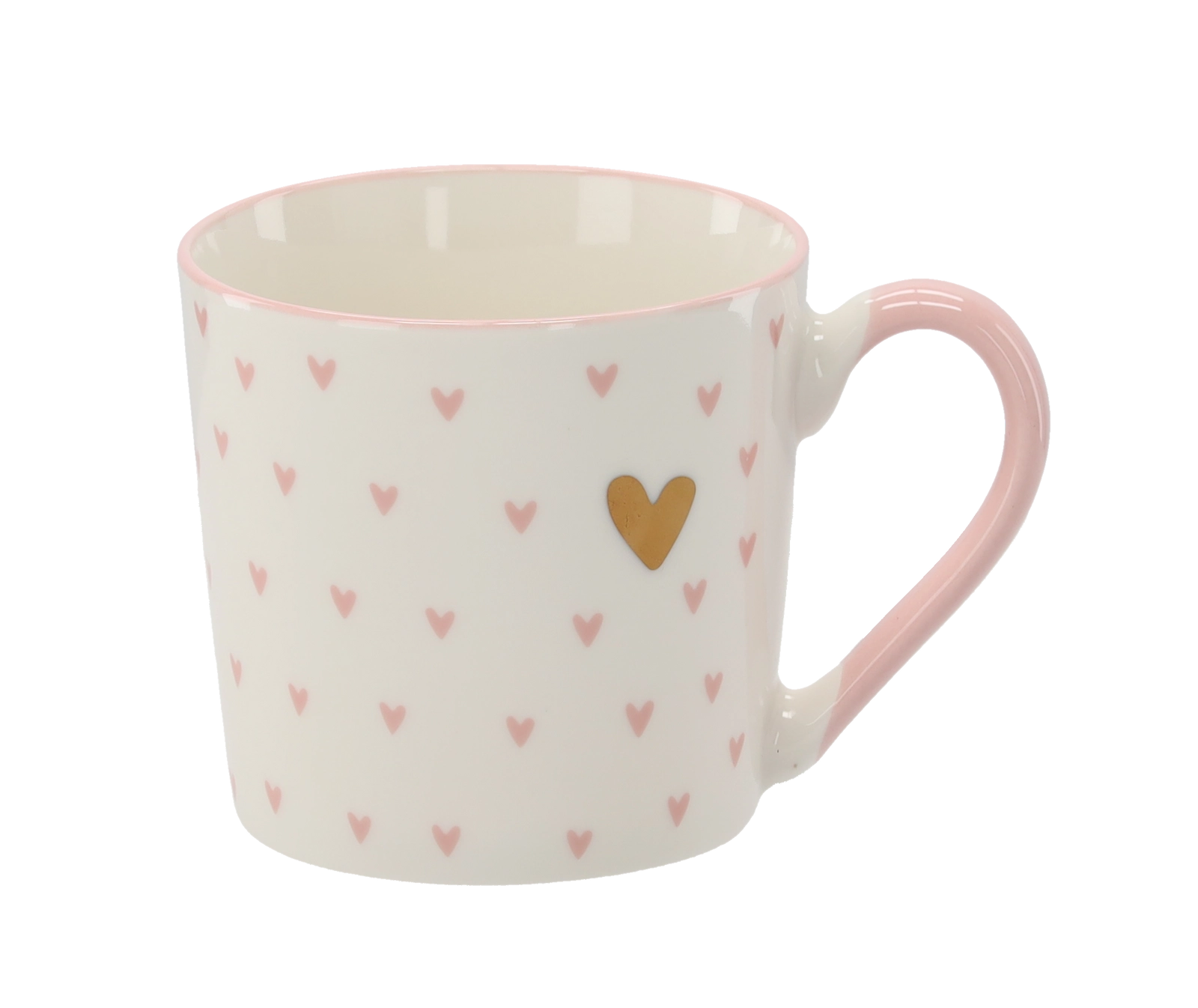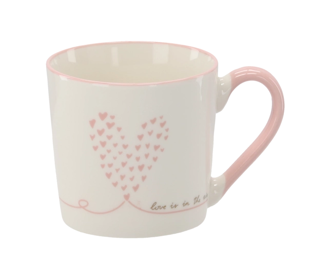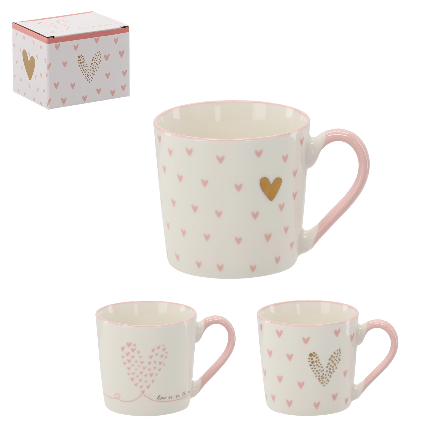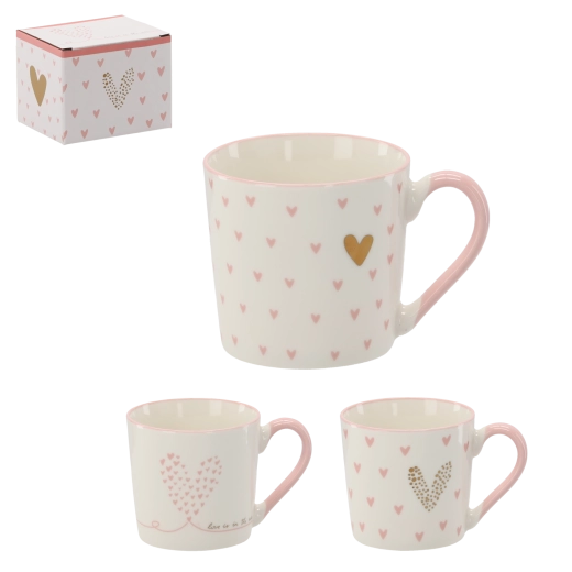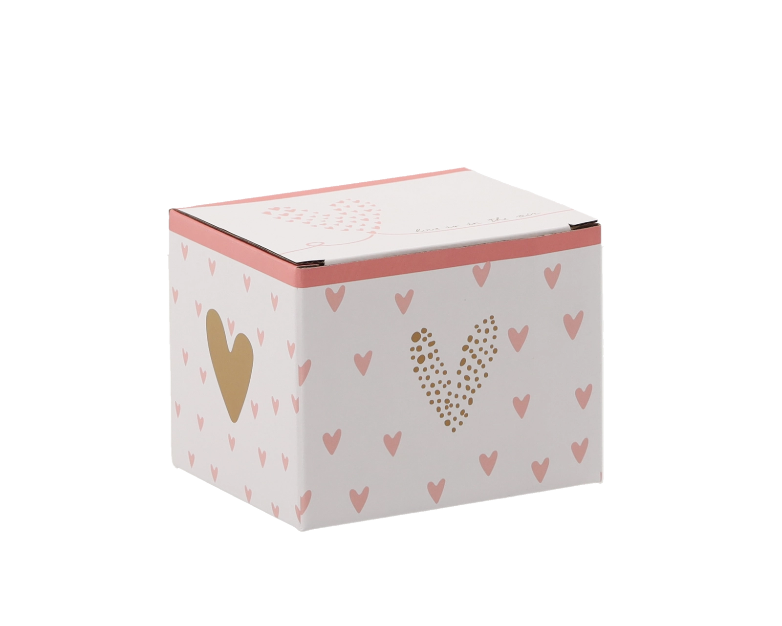 Stylová krabička s růžovými a zlatými srdíčky dělá z hrnku ideální dárek pro každou příležitost.