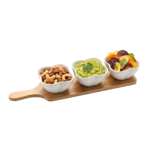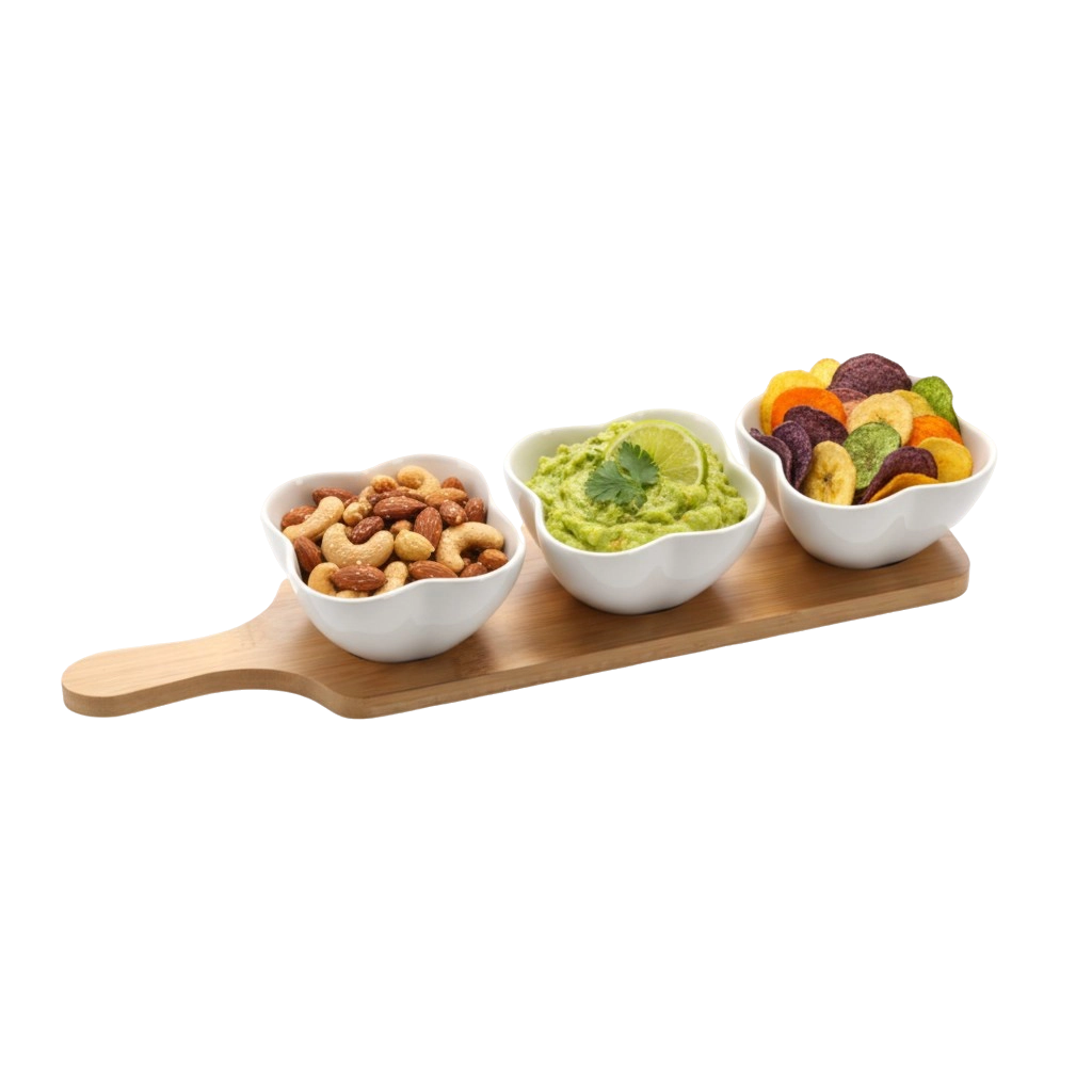 Elegantní sada tří porcelánových misek ve tvaru čtyřlístku na podlouhlém bambusovém podnose je ideální pro servírování předkrmů, dipů a pochutin. Misky z kvalitní bílé keramiky jsou odolné, snadno se udržují a lze je použít v myčce i mikrovlnce. Bambusový podnos je lehce udržitelný, odolný vůči vlhkosti a zajišťuje stabilitu při přenášení.