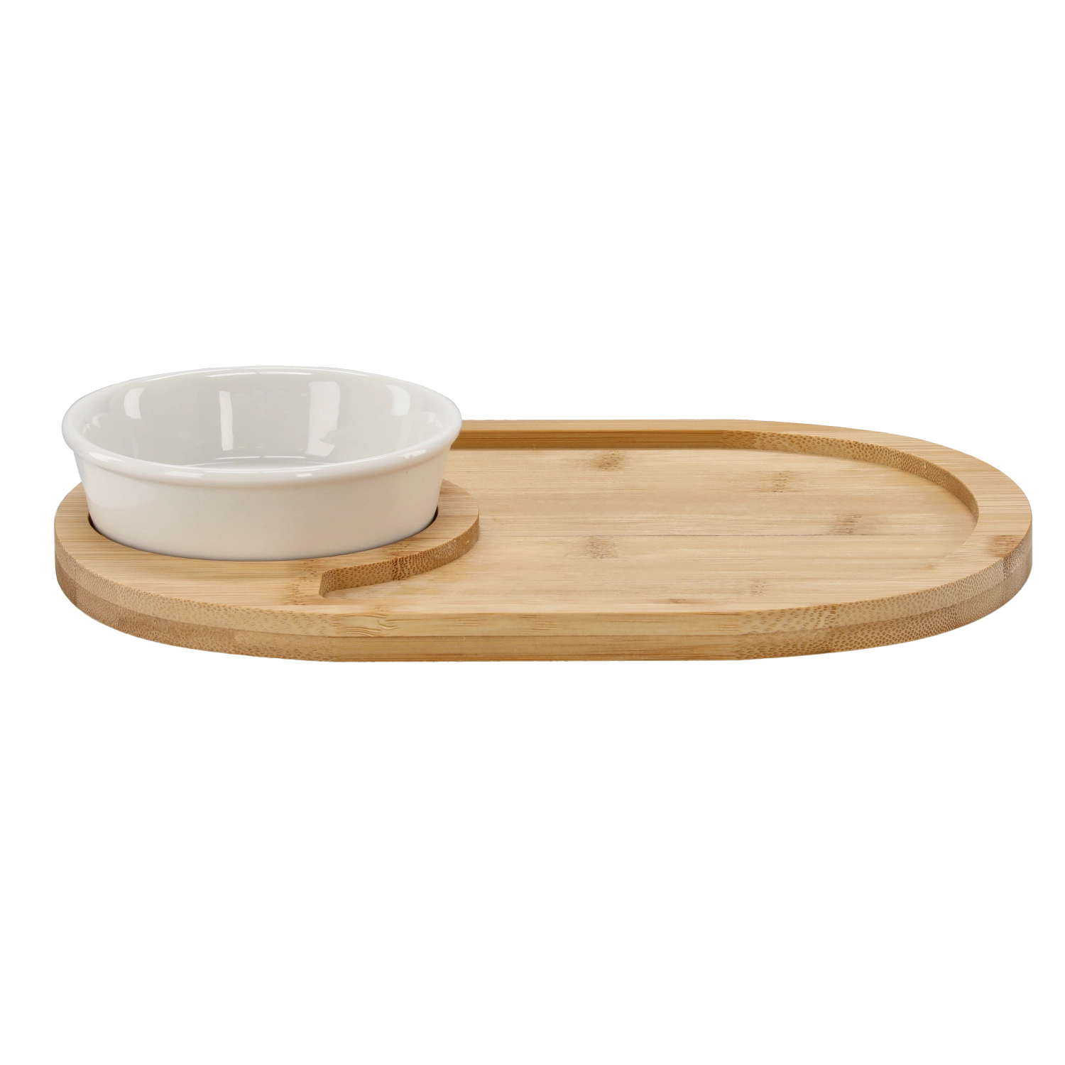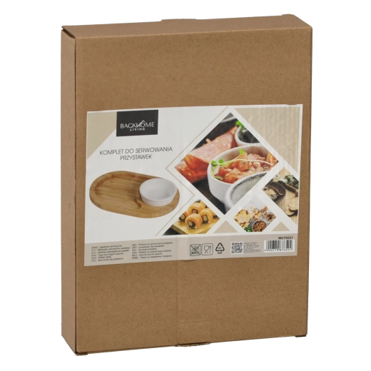 Tato univerzální sada pro servírování předkrmů zaujme moderním přírodním vzhledem a funkčním provedením. Oválný bambusový tác s vyhrazeným prostorem pro porcelánovou mističku umožňuje přehledně aranžovat sýry, uzeniny, olivy či pečivo a zároveň podávat omáčky, dipy nebo pesta. Díky rozměrům 28 × 21 × 4 cm nabízí dostatek místa pro rozmanité občerstvení.