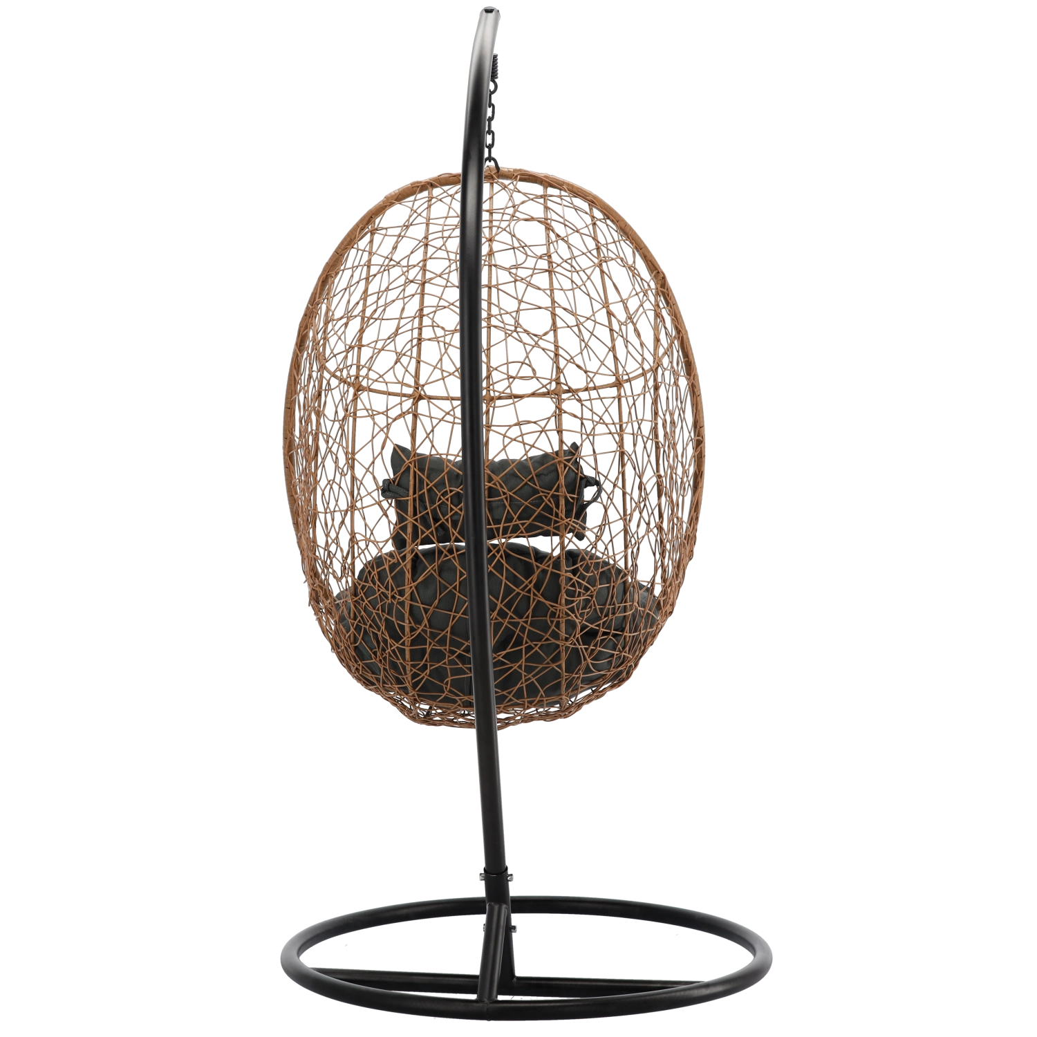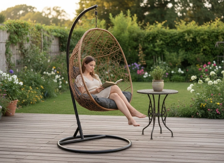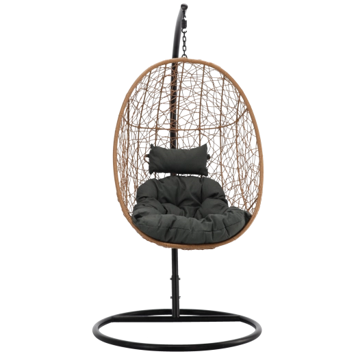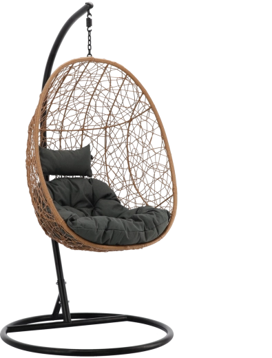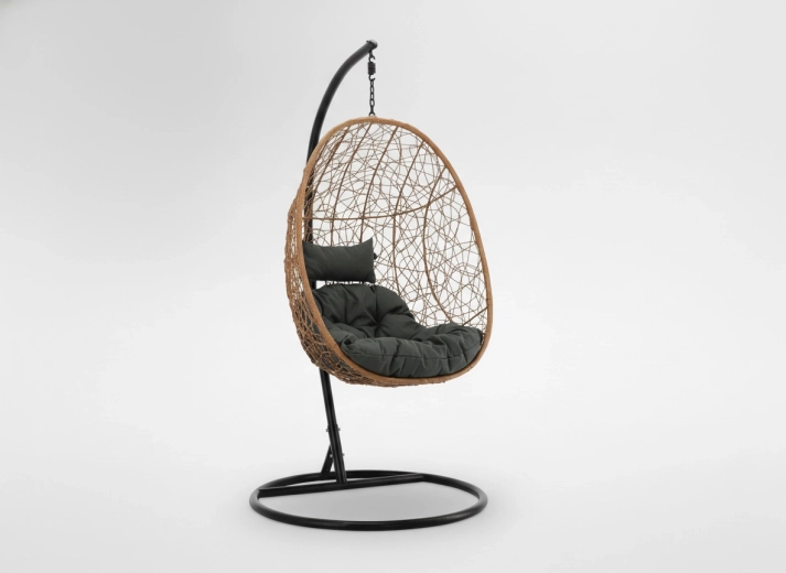 Díky univerzálním barvám (přírodní koš, tmavě šedé podušky, matně černý rám) snadno zapadne do obývacího pokoje, zimní zahrady i na terasu. Nosnost 150 kg a promyšlené rozměry koše 115 × 90 × 67 cm poskytují dostatek prostoru a pocit bezpečí.