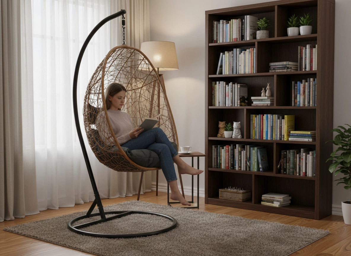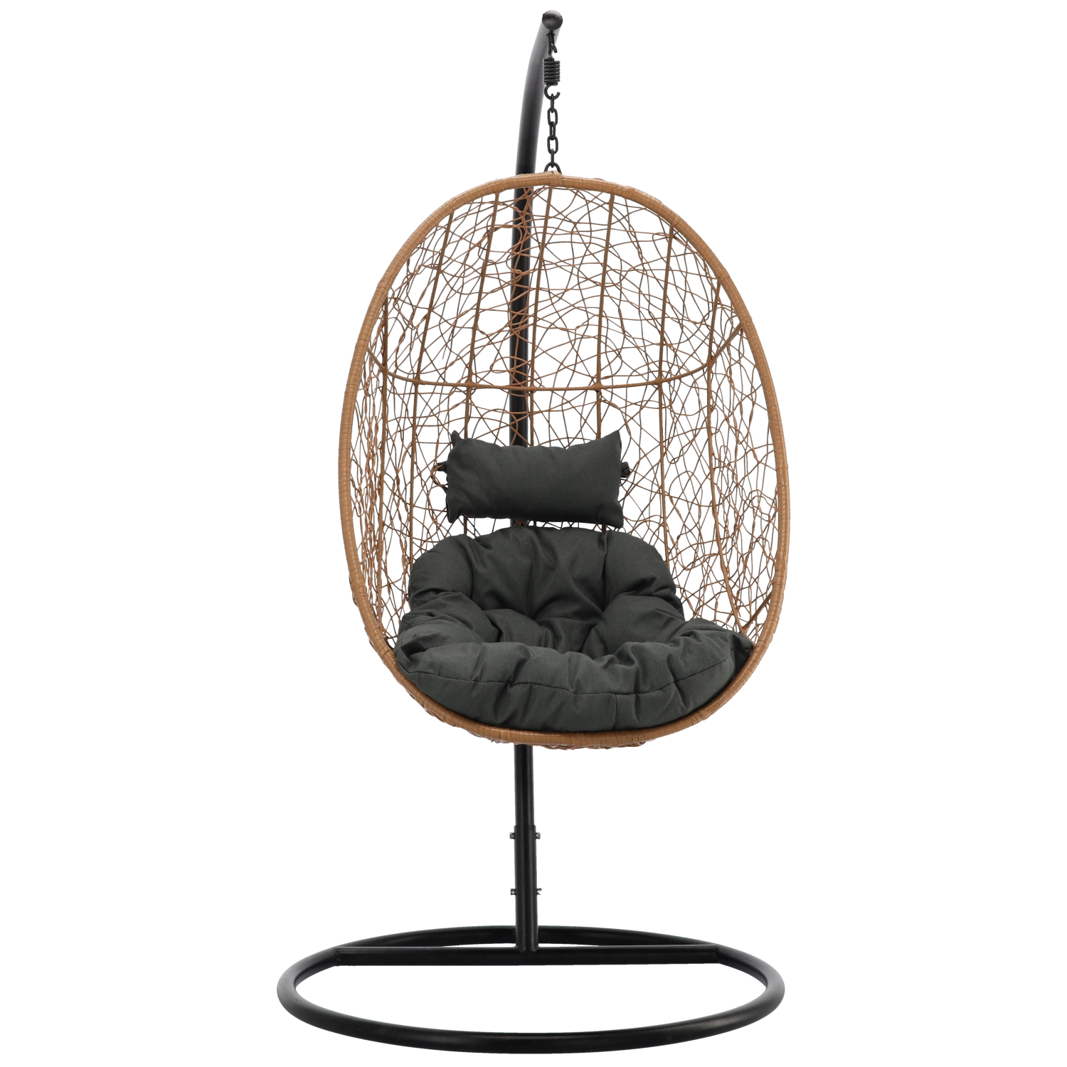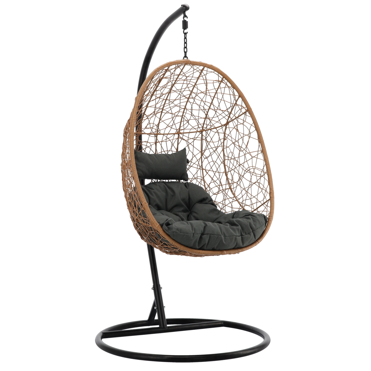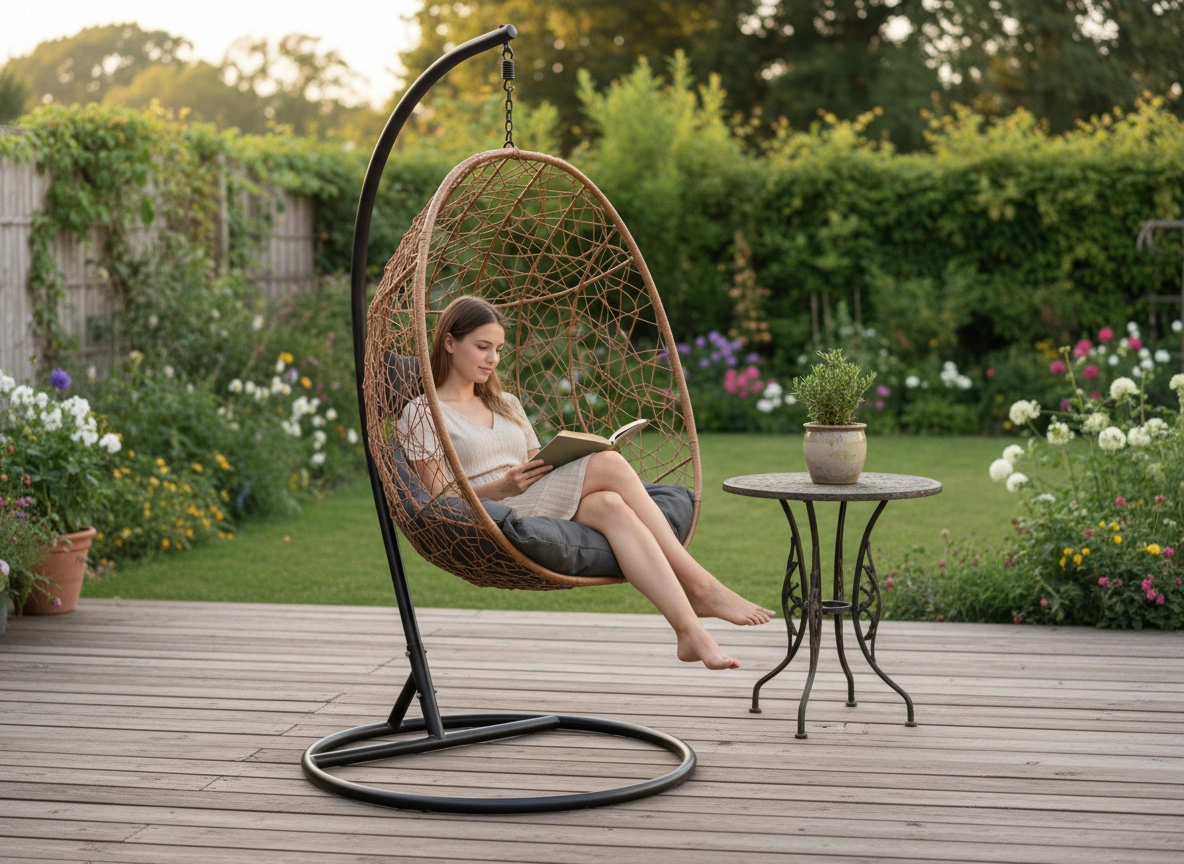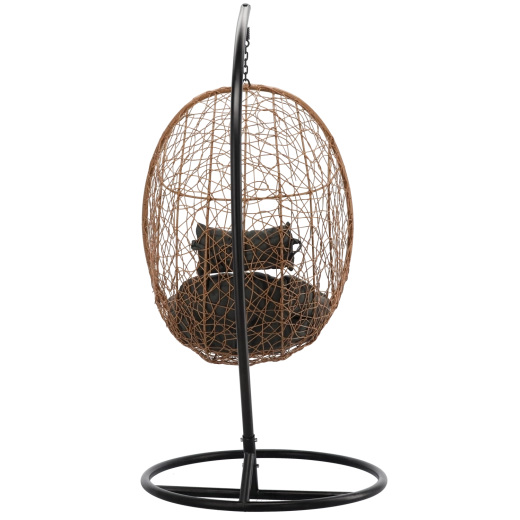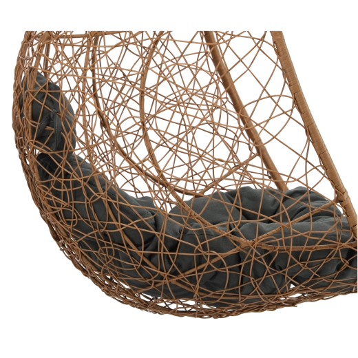 Toto závěsné křeslo v přírodním odstínu kombinuje boho estetiku s moderní elegancí. Vzdušné výplety, robustní ocelový stojan s kruhovou základnou a bohatě polstrovaný sedák s opěrkou hlavy vytvářejí pohodlné hnízdo pro čtení, lenošení i krátký odpočinek.