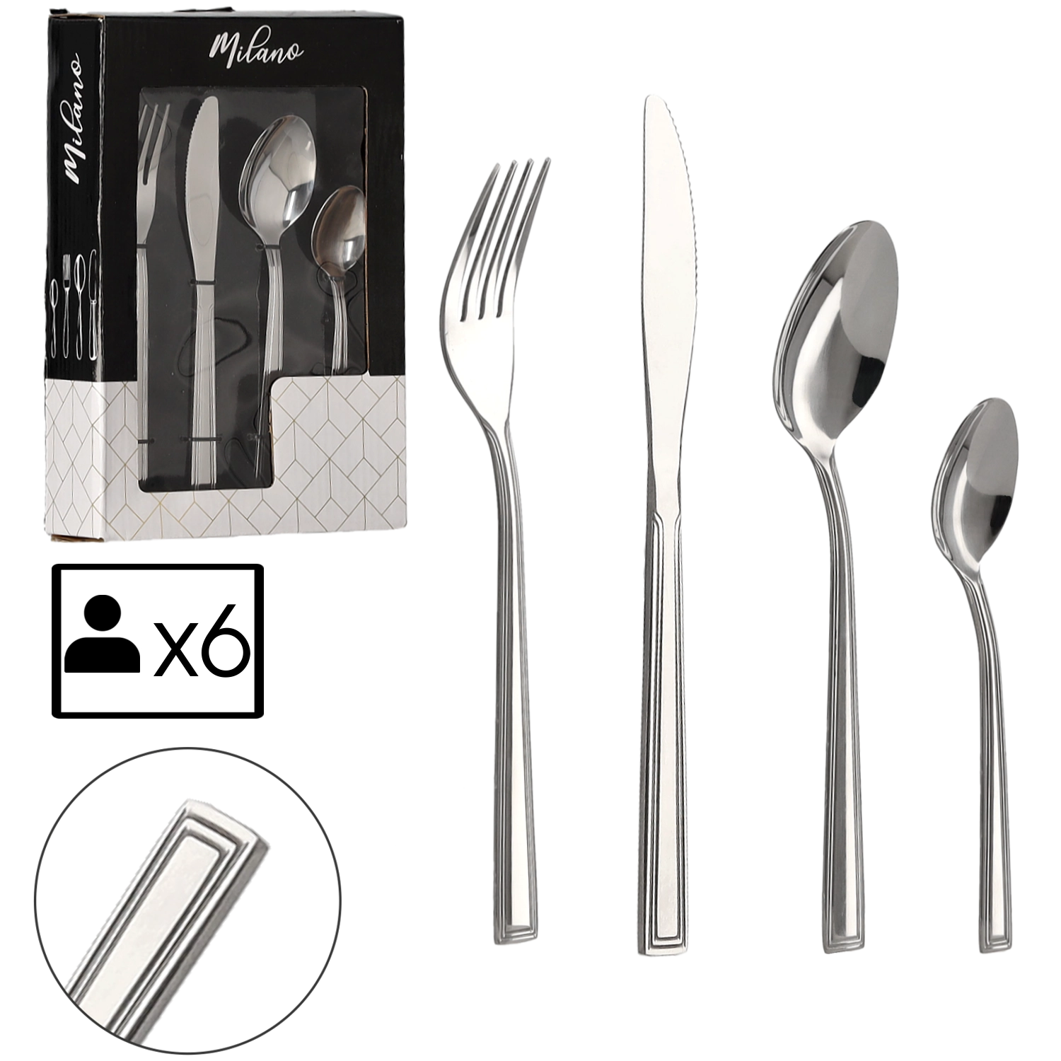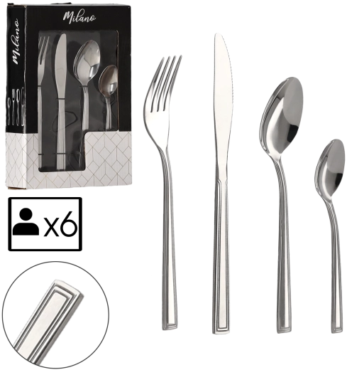 • Kompletní výbava: 6x nůž, 6x vidlička, 6x polévková lžíce, 6x čajová lžička