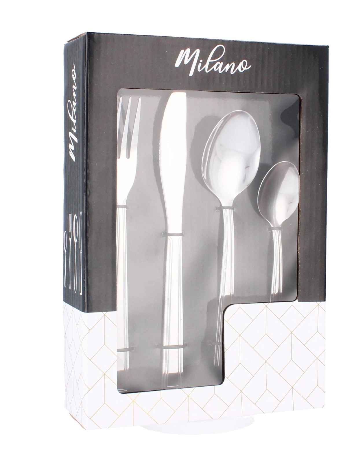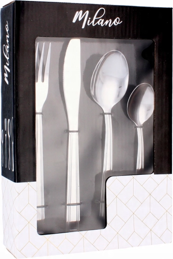Elegantní sada příborů Milano přináší 24 dílů pro kompletní stolování – 6 nožů, 6 vidliček, 6 polévkových lžic a 6 čajových lžiček. Kombinuje klasický design, jednoduchou eleganci a kvalitní zpracování pro každodenní použití i slavnostní příležitosti.