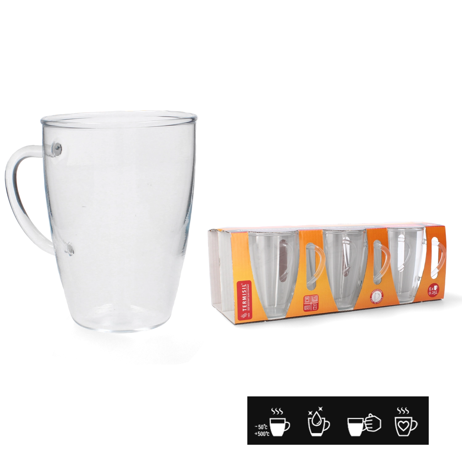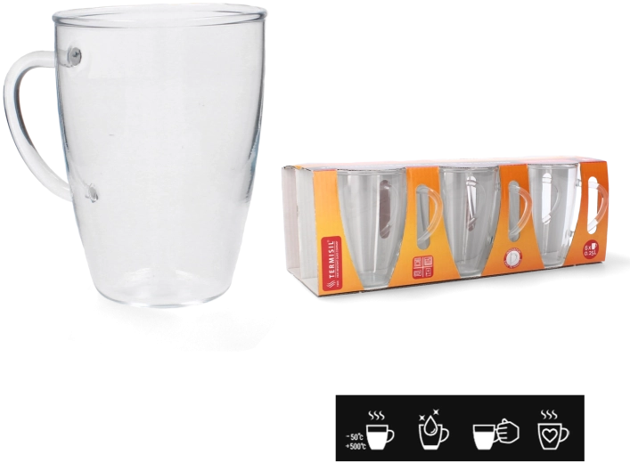 Elegantní sada šesti sklenic Termisil Agata o objemu 250 ml je ideální pro podávání horkých i studených nápojů. Díky žáruvzdornému borosilikátovému sklu se sklenice vyznačují vysokou odolností vůči teplotám a náhlým změnám, snadnou údržbou v myčce a pohodlným držením díky praktickému uchu. Skvěle se hodí na čaj, kávu, bylinkové nálevy i džusy a dodají vašemu stolu elegantní vzhled.