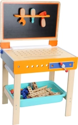 Objevte chytrý dětský stůl, který se jedním pohybem promění z kreslícího pultu na pracovní ponk. Sklápěcí kreslící panel s poličkou na nářadí, pracovní deska s otvory pro uchycení dílů a držák papírové role na boku dělají z tohoto stolu dokonalé místo pro tvoření i stavění.