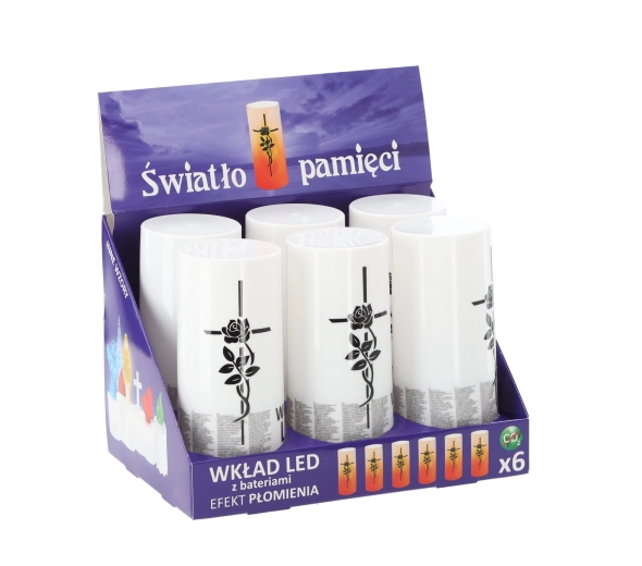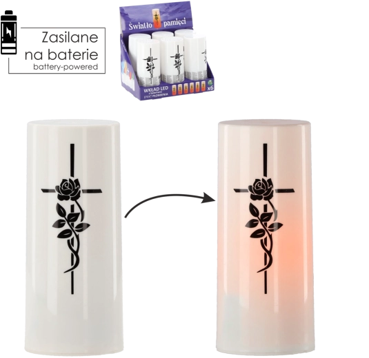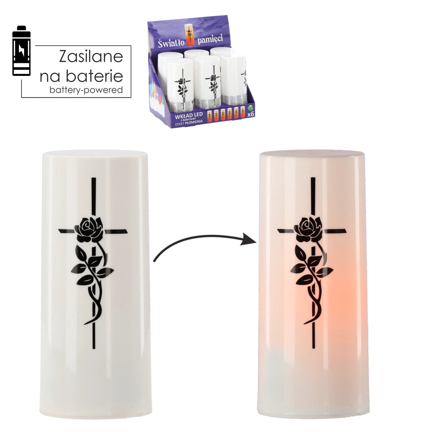 LED vložka do svítilny s efektem živého plamene a decentním křížem je elegantní a ekologická náhrada za parafínové či olejové svíčky. Teplé bílé světlo realisticky imituje mihotající plamen, který navozuje klid a pietu bez kouře a sazí. Díky provozu na baterie je ideální pro hřbitovní svítilny, domácí lucerny i interiérové dekorace.
