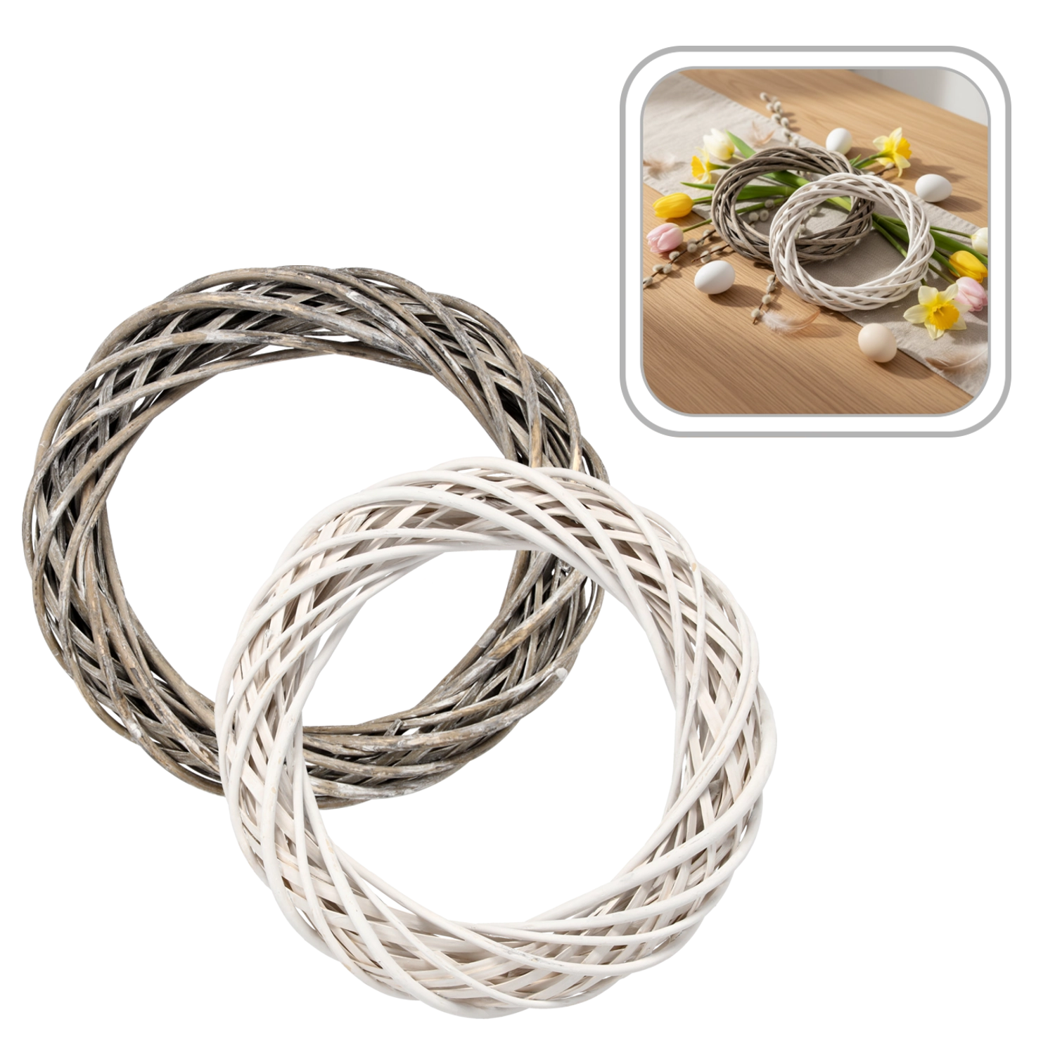 Díky ruční výrobě a pevně spletenému proutí je věnec odolný, tvarově stálý a dlouhodobě si zachovává svůj přírodní vzhled. Neutrální bílá a šedá barva se snadno kombinuje s různými barvami i styly – od tradičního venkovského po moderní minimalismus.