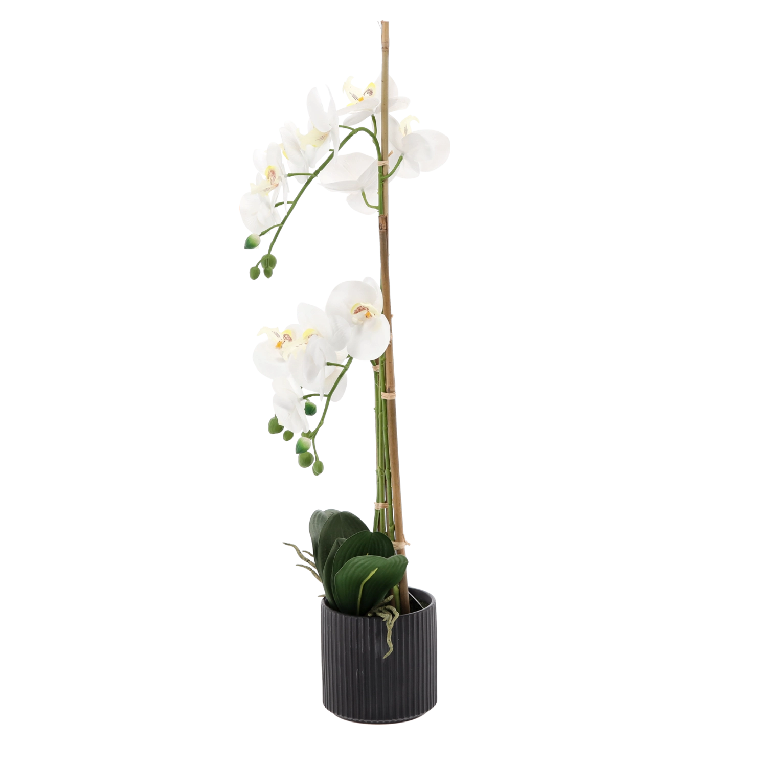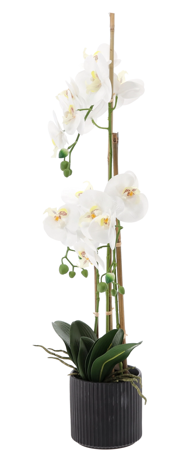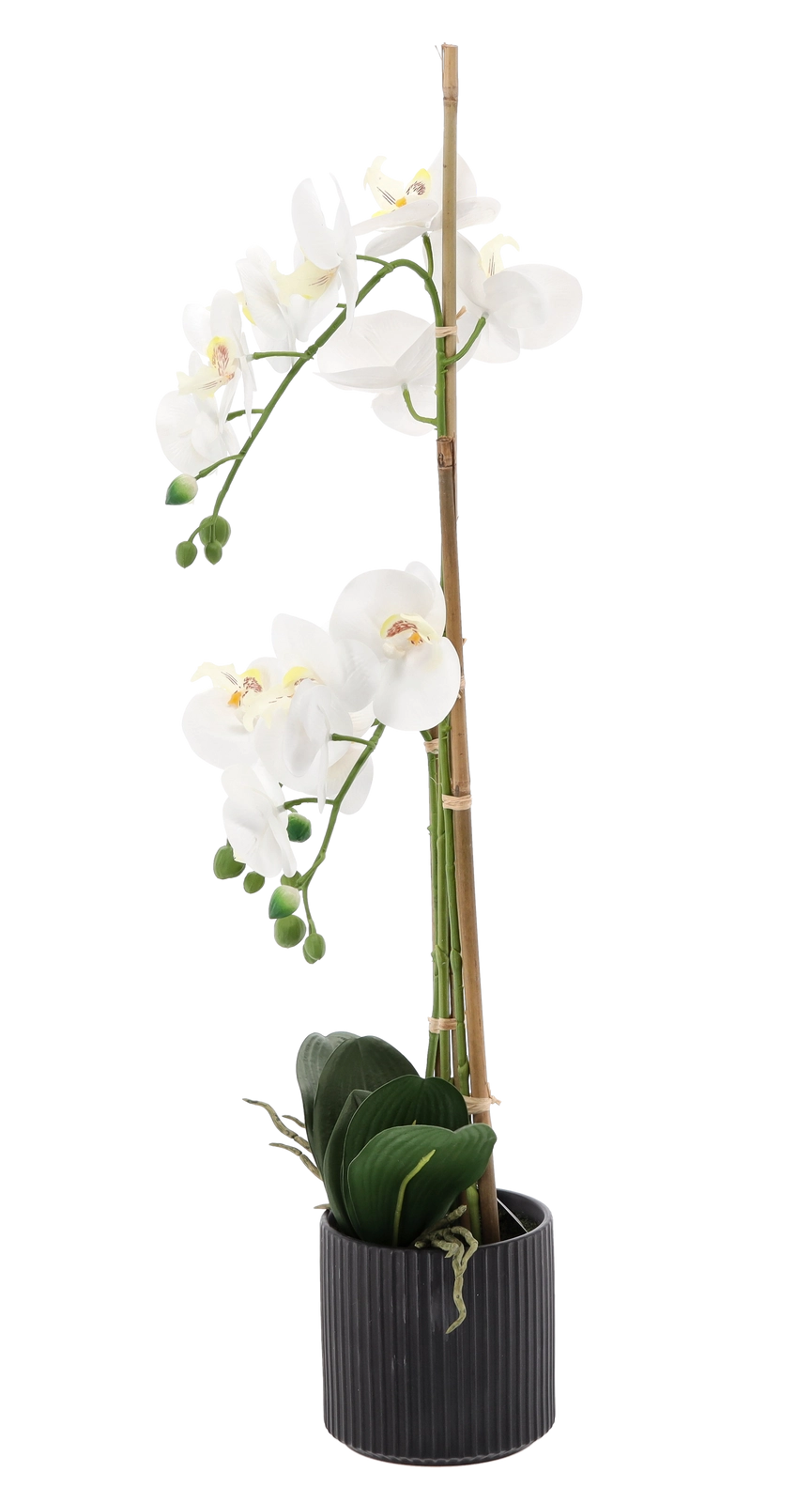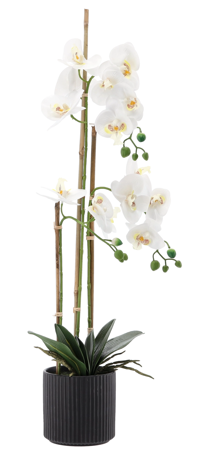 Tato designová umělá orchidej je vysoká 77 cm a je osazená v decentním černém žebrovaném květináči, který podtrhuje její elegantní vzhled. Díky věrnému zpracování květů, poupat a lesklých listů přináší do prostoru přírodní atmosféru bez nutnosti údržby.