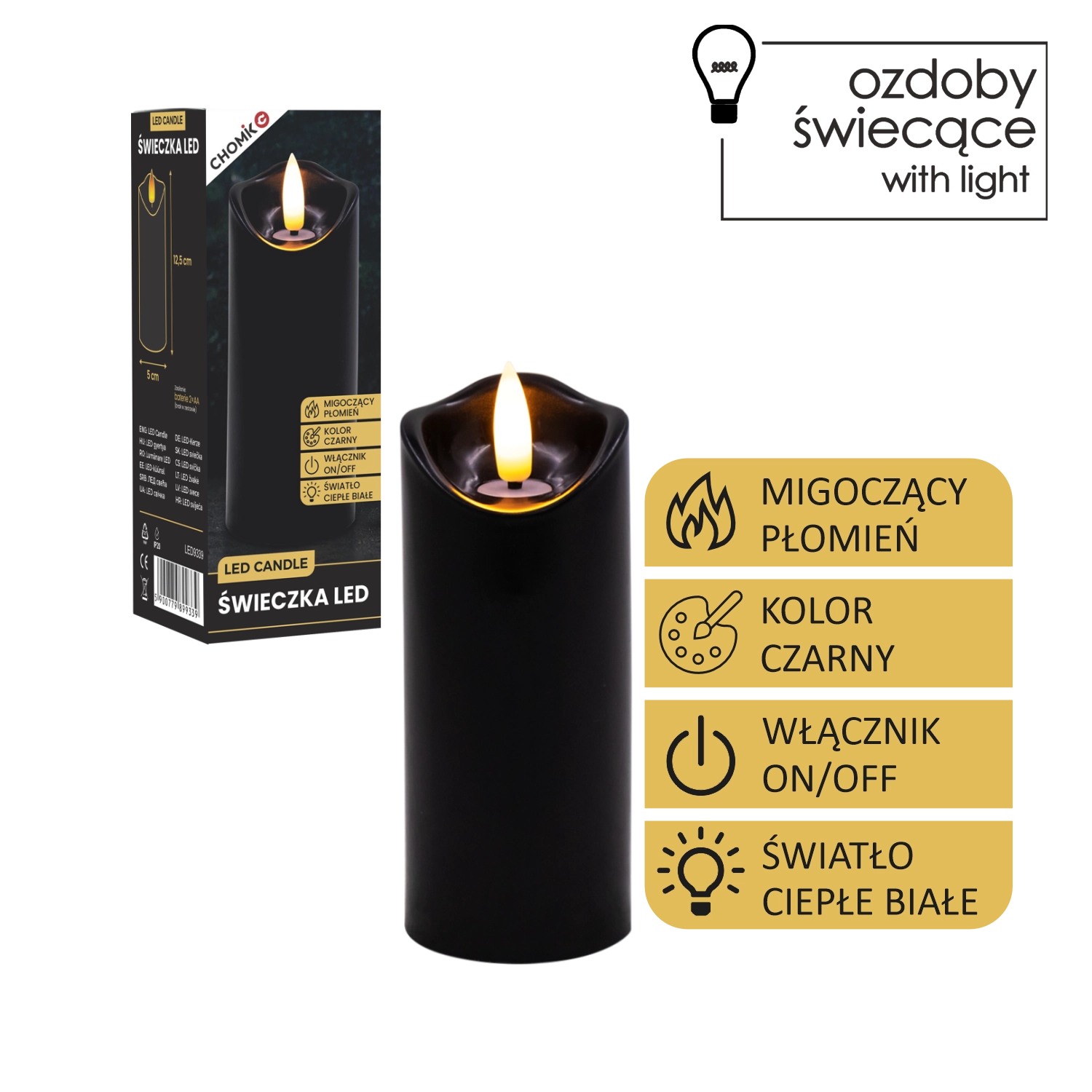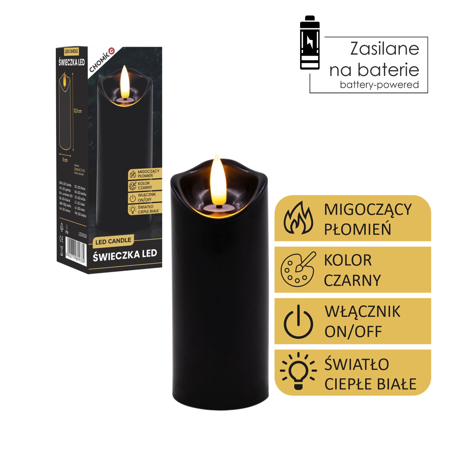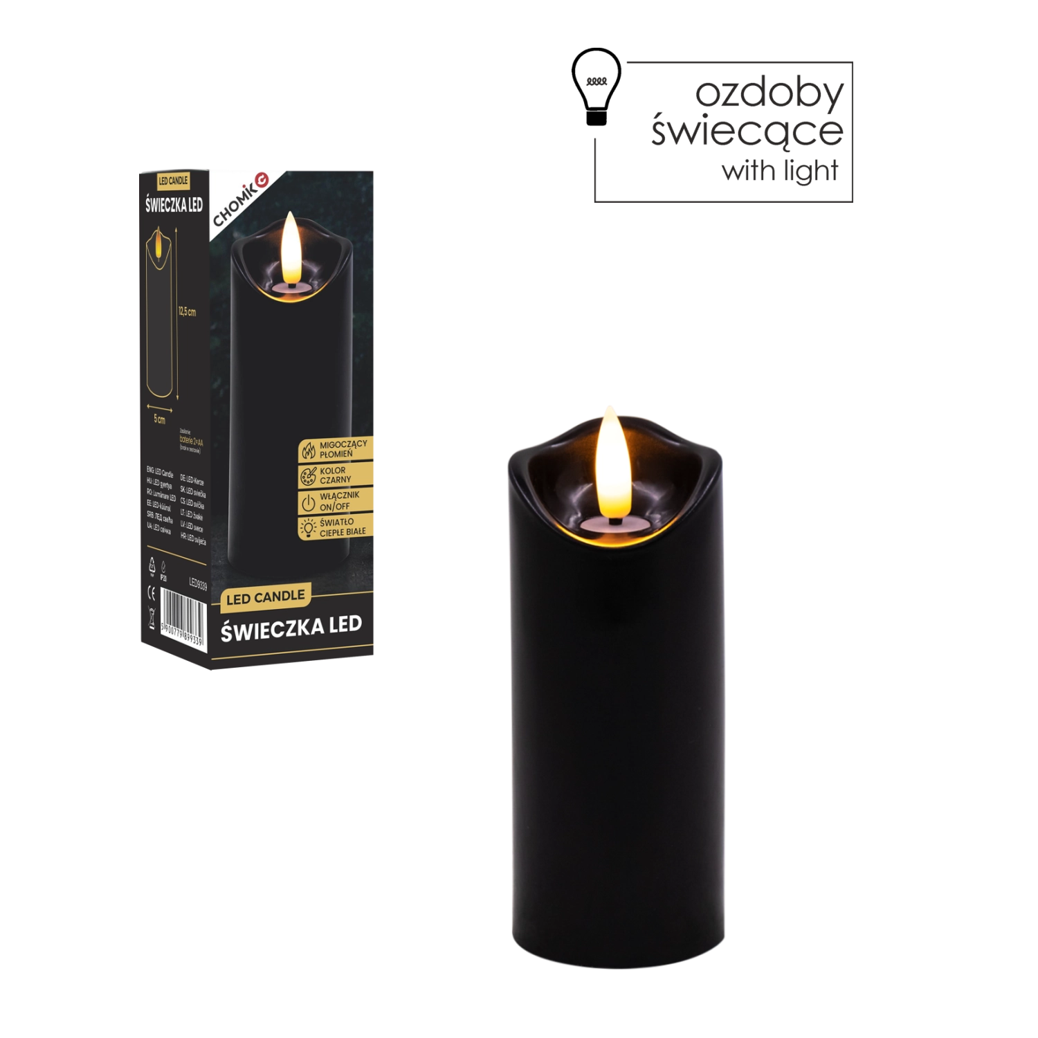 Vytvořte si příjemné světlo kdykoli a kdekoli. Tato černá LED svíčka o rozměrech 5 × 12,5 cm svítí teplou bílou barvou a díky realistickému mihotání plamene věrně napodobuje skutečnou svíčku – bez nepořádku, zápachu a rizika otevřeného ohně.