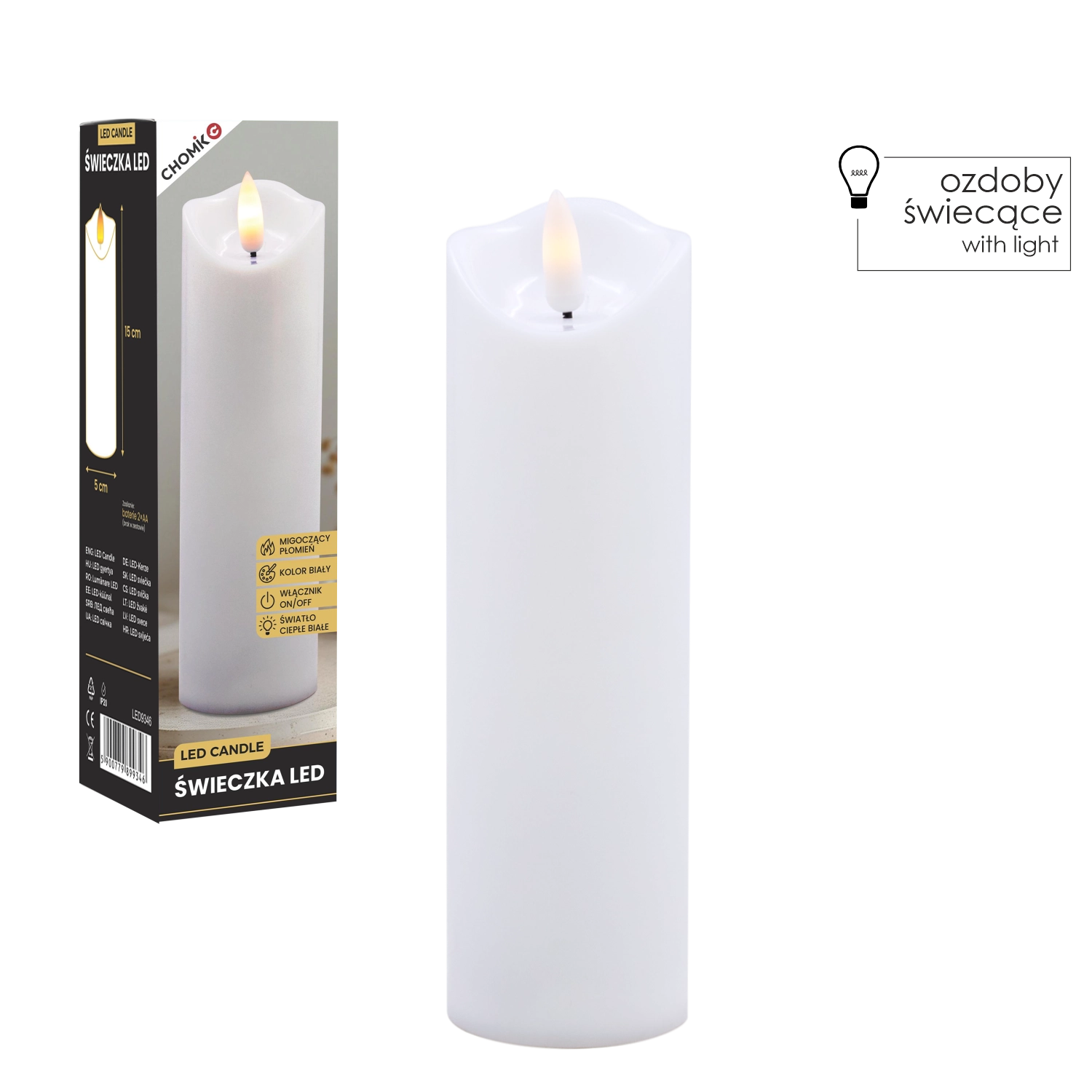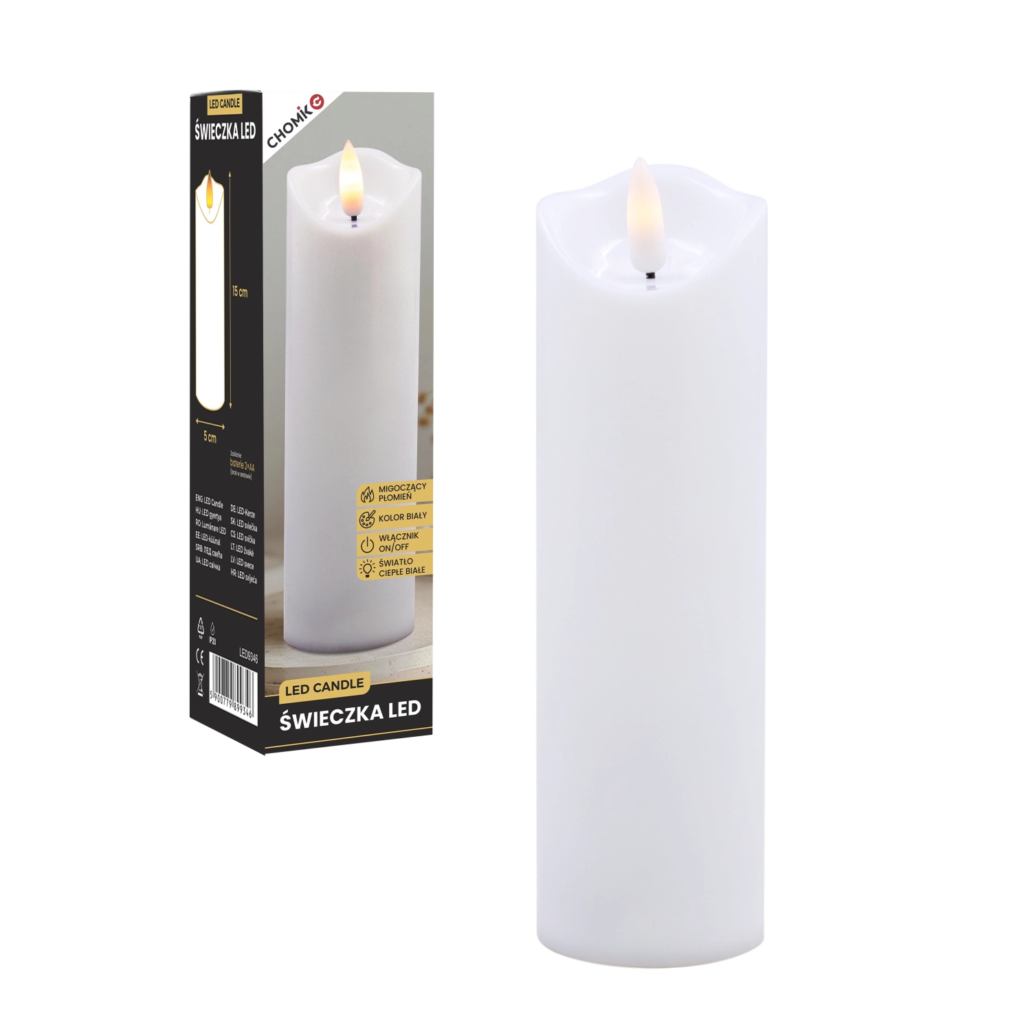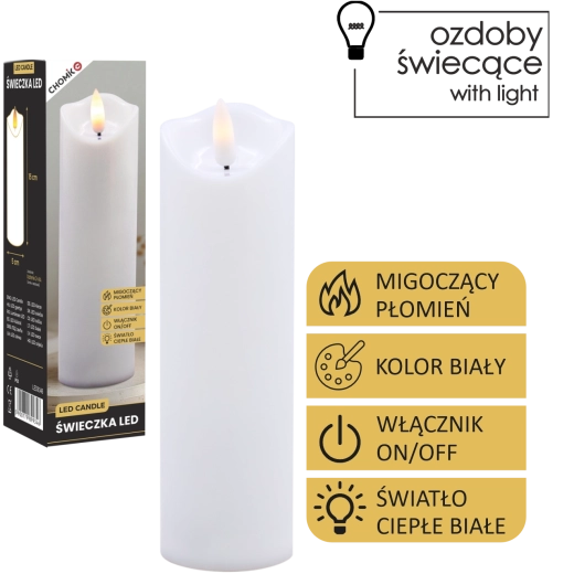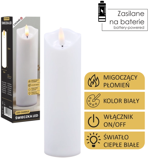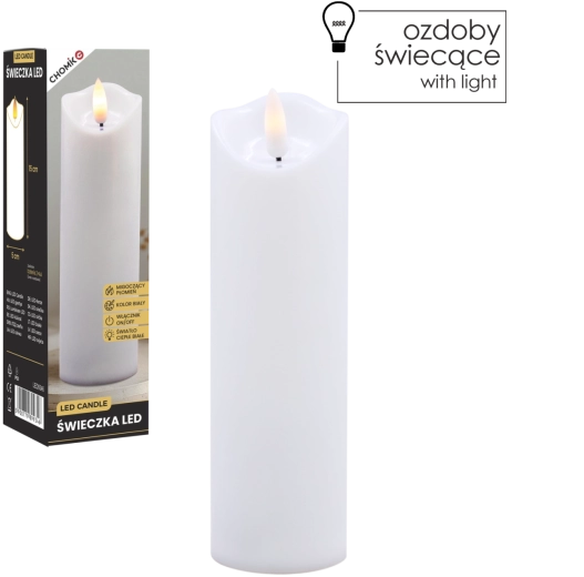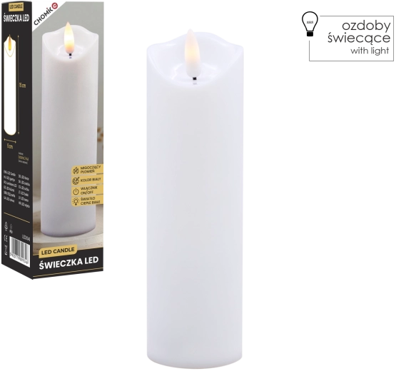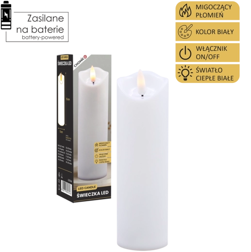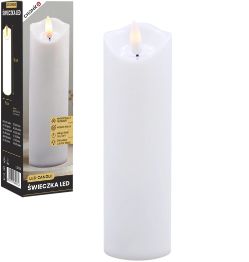 Tato realistická LED svíčka v bílé barvě nabízí efekt jemně mihotajícího teplého světla, které věrně napodobuje plamen bez rizika otevřeného ohně. Je ideální pro domácí výzdobu, slavnostní tabule, relaxační večery či jako bezpečná alternativa do domácností s dětmi a domácími mazlíčky.