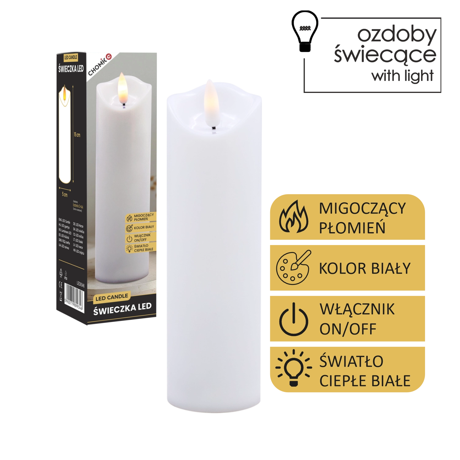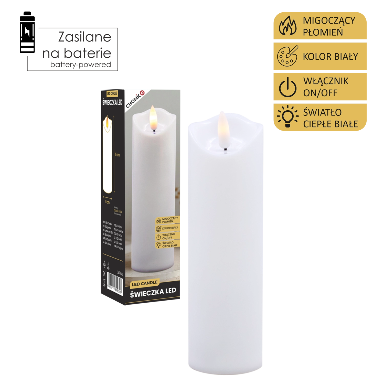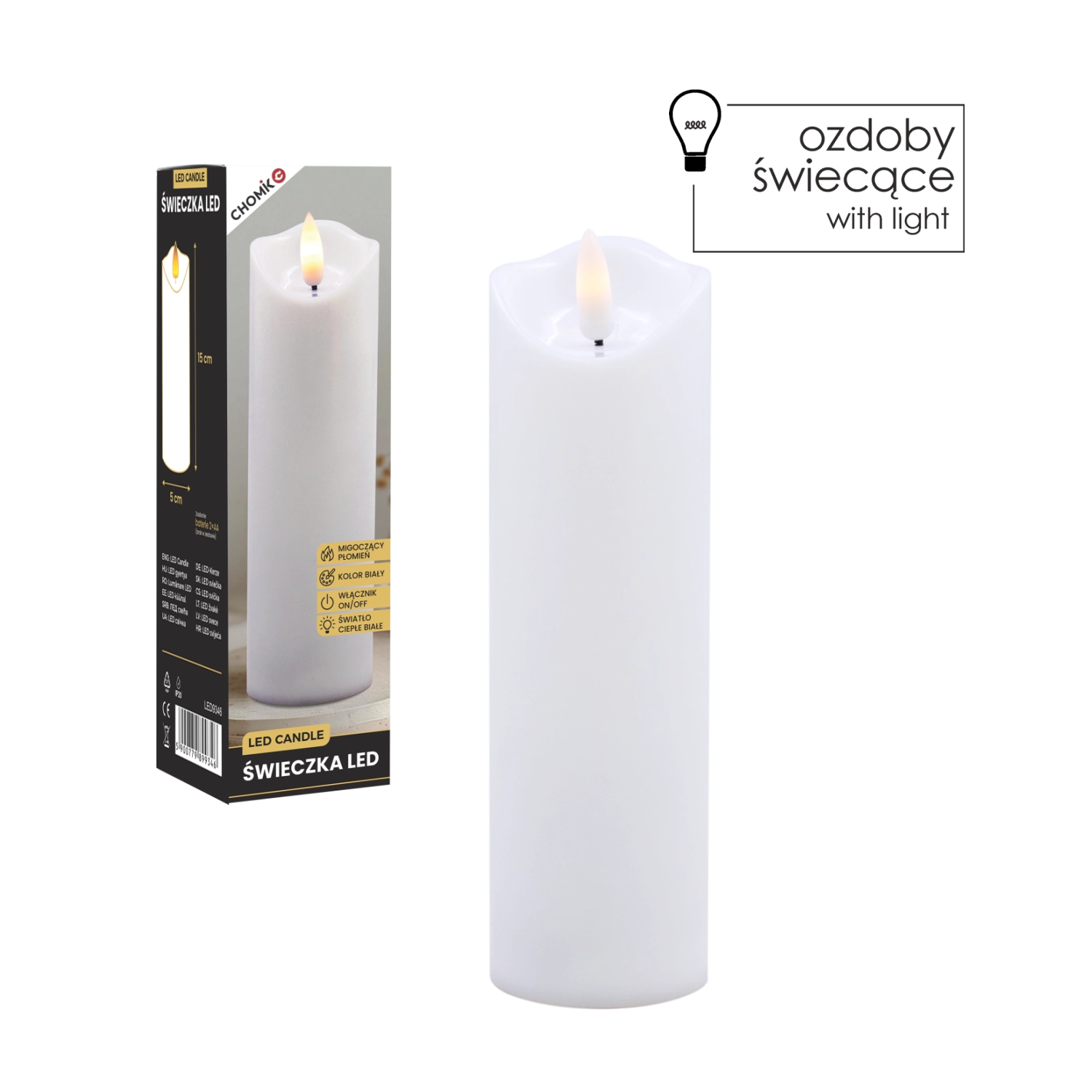 Tato realistická LED svíčka v bílé barvě nabízí efekt jemně mihotajícího teplého světla, které věrně napodobuje plamen bez rizika otevřeného ohně. Je ideální pro domácí výzdobu, slavnostní tabule, relaxační večery či jako bezpečná alternativa do domácností s dětmi a domácími mazlíčky.