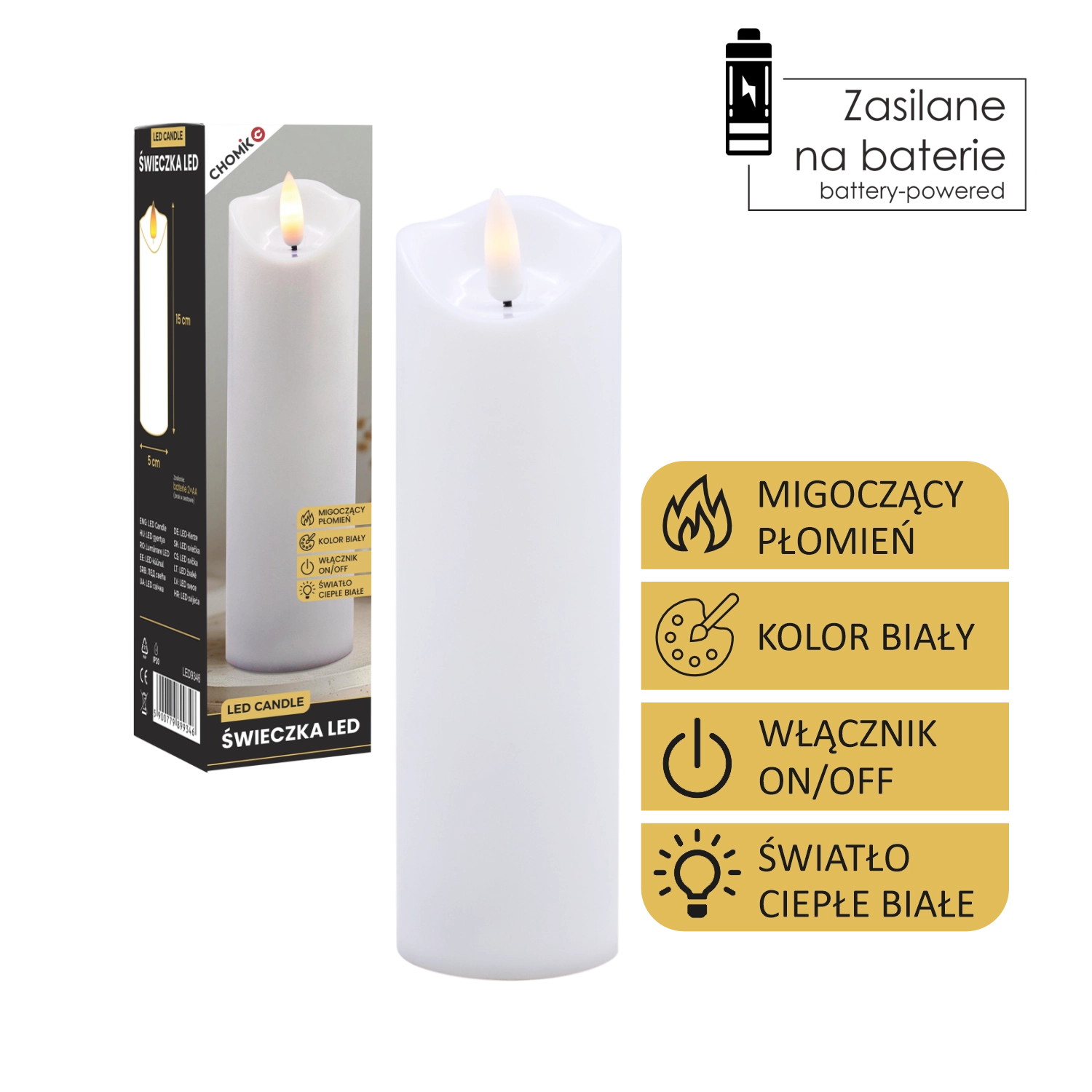 Díky univerzálním rozměrům 5 × 17,5 cm ji snadno umístíte do svícnů, luceren nebo ji využijete jako vložitelný prvek do ozdobných nádob. Ovládání je maximálně jednoduché díky přepínači On/Off, napájení zajišťují 2 baterie AA (nejsou součástí balení), takže svíčku můžete umístit kamkoli bez přívodního kabelu.