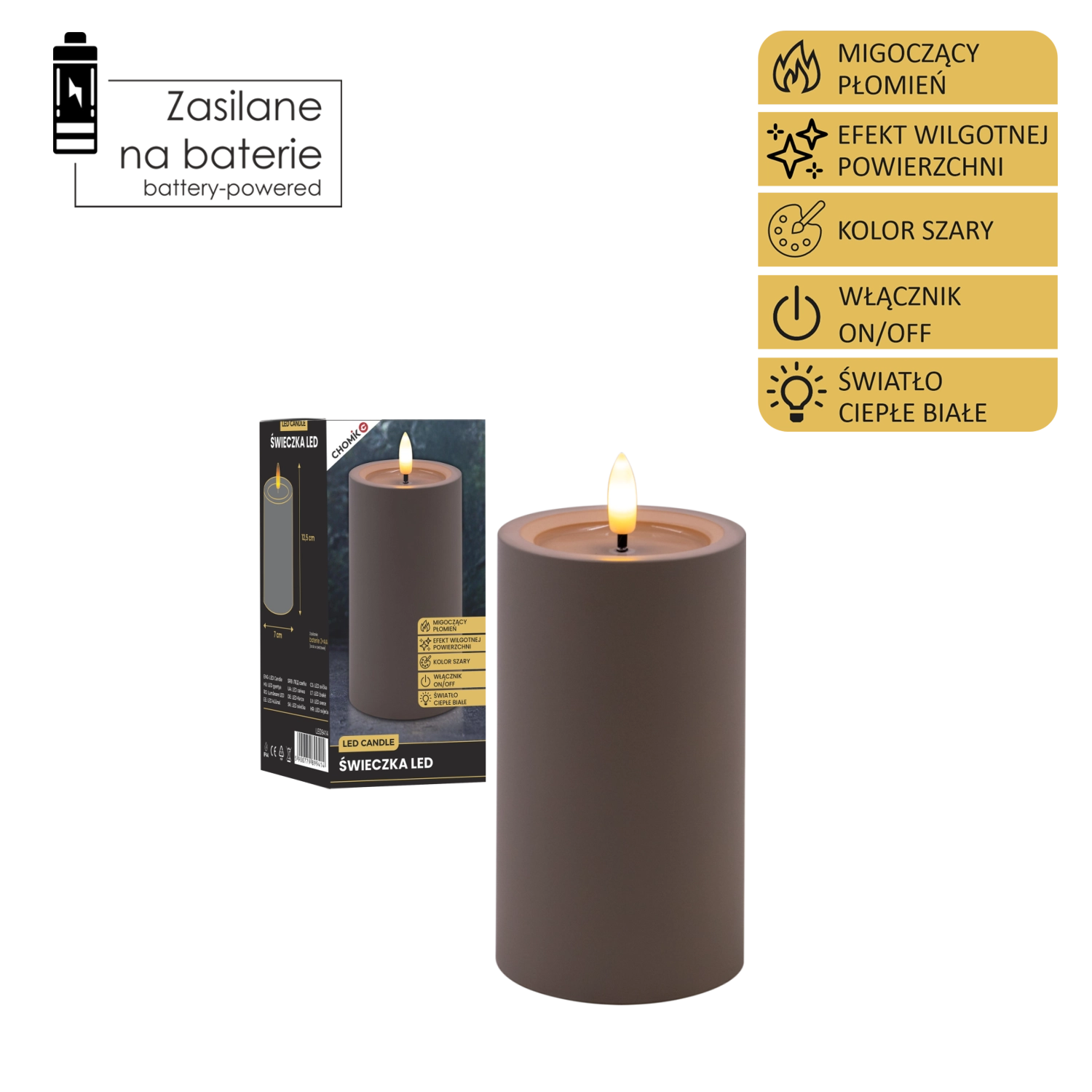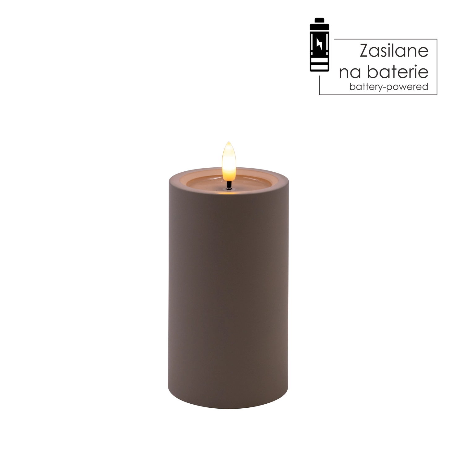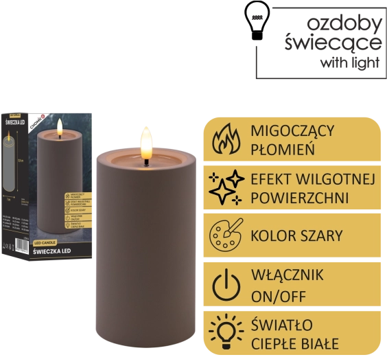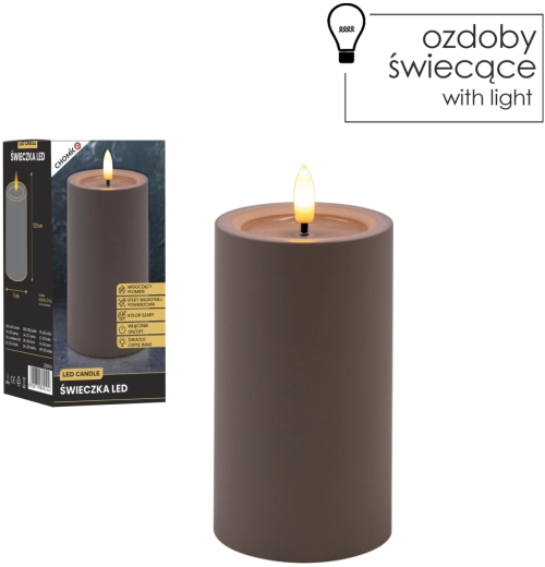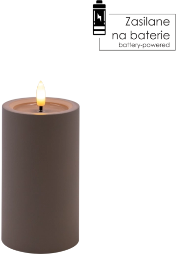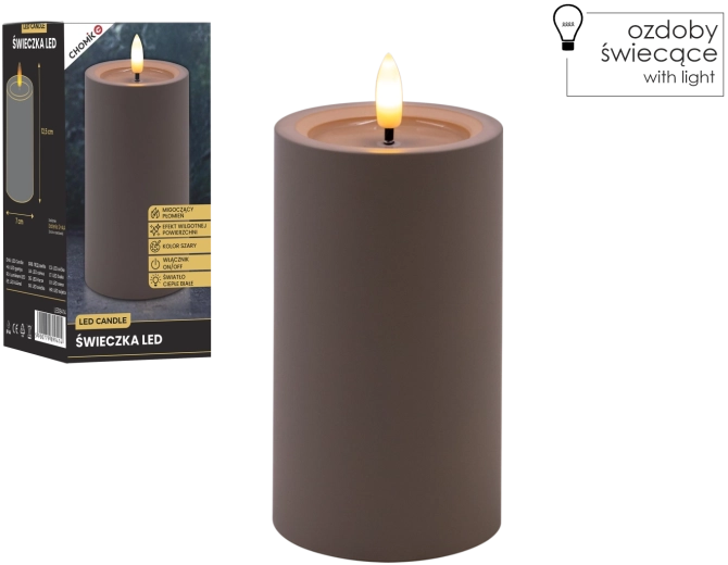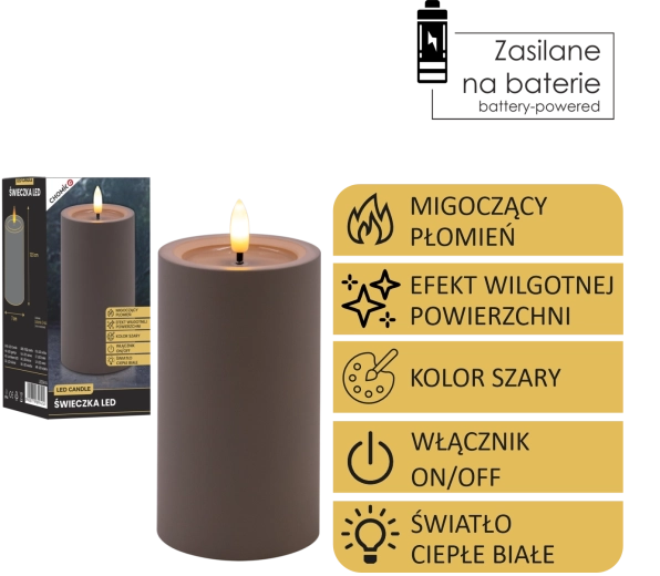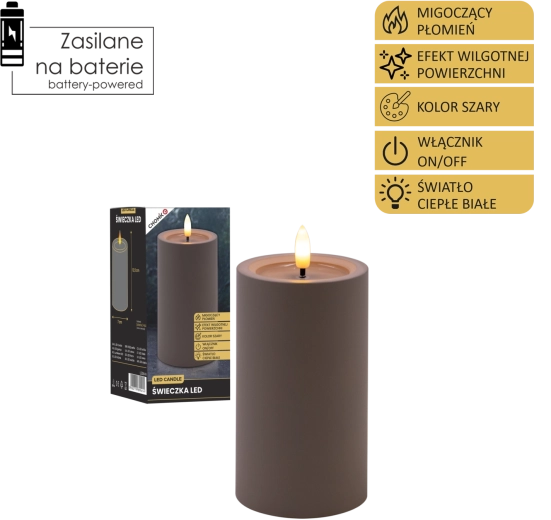 Elegantní šedá LED svíčka s realistickým, mihotavým plamenem v teplé bílé barvě a efektem vlhké horní hrany pro přirozený vzhled. Skvěle se hodí do interiéru, bezpečná alternativa ke klasické svíčce, napájená 2× AA bateriemi (nejsou součástí balení).