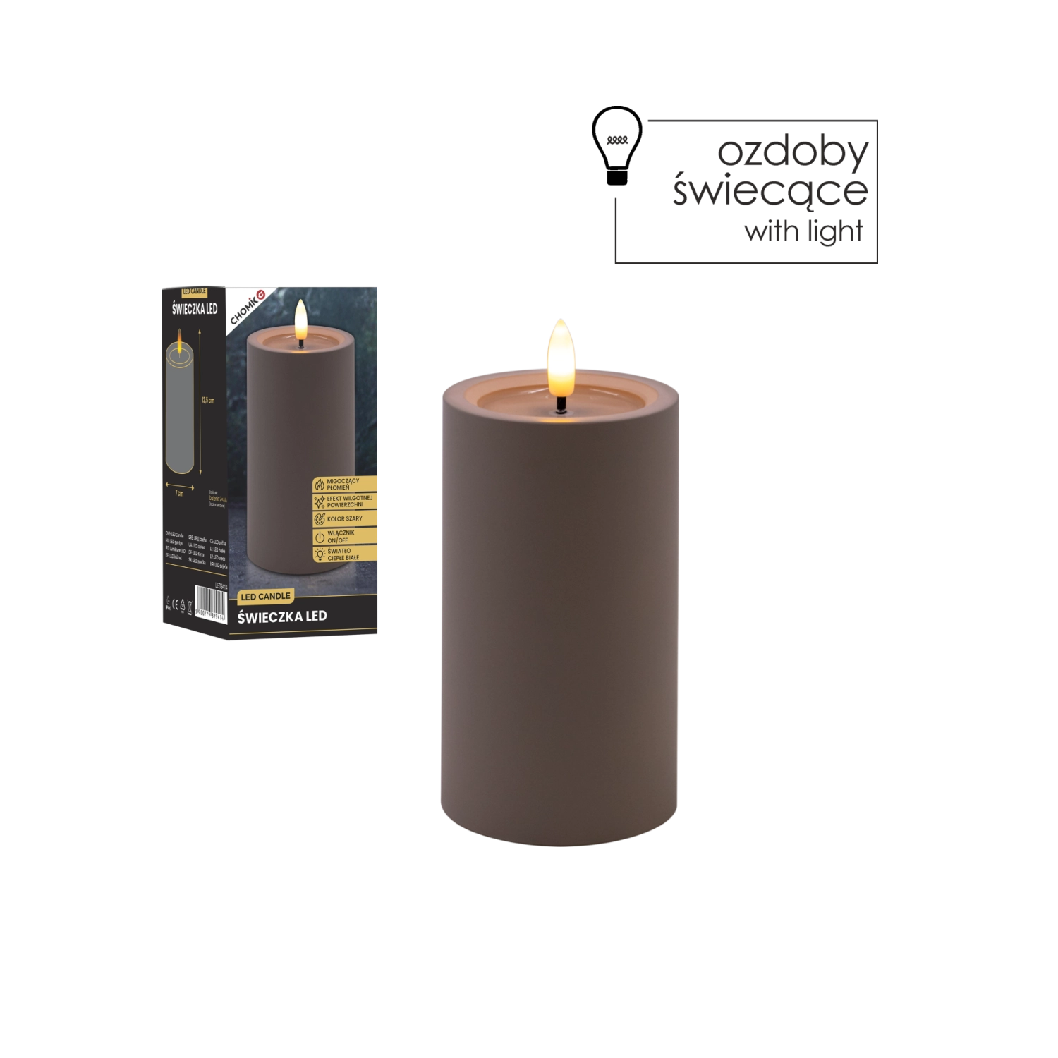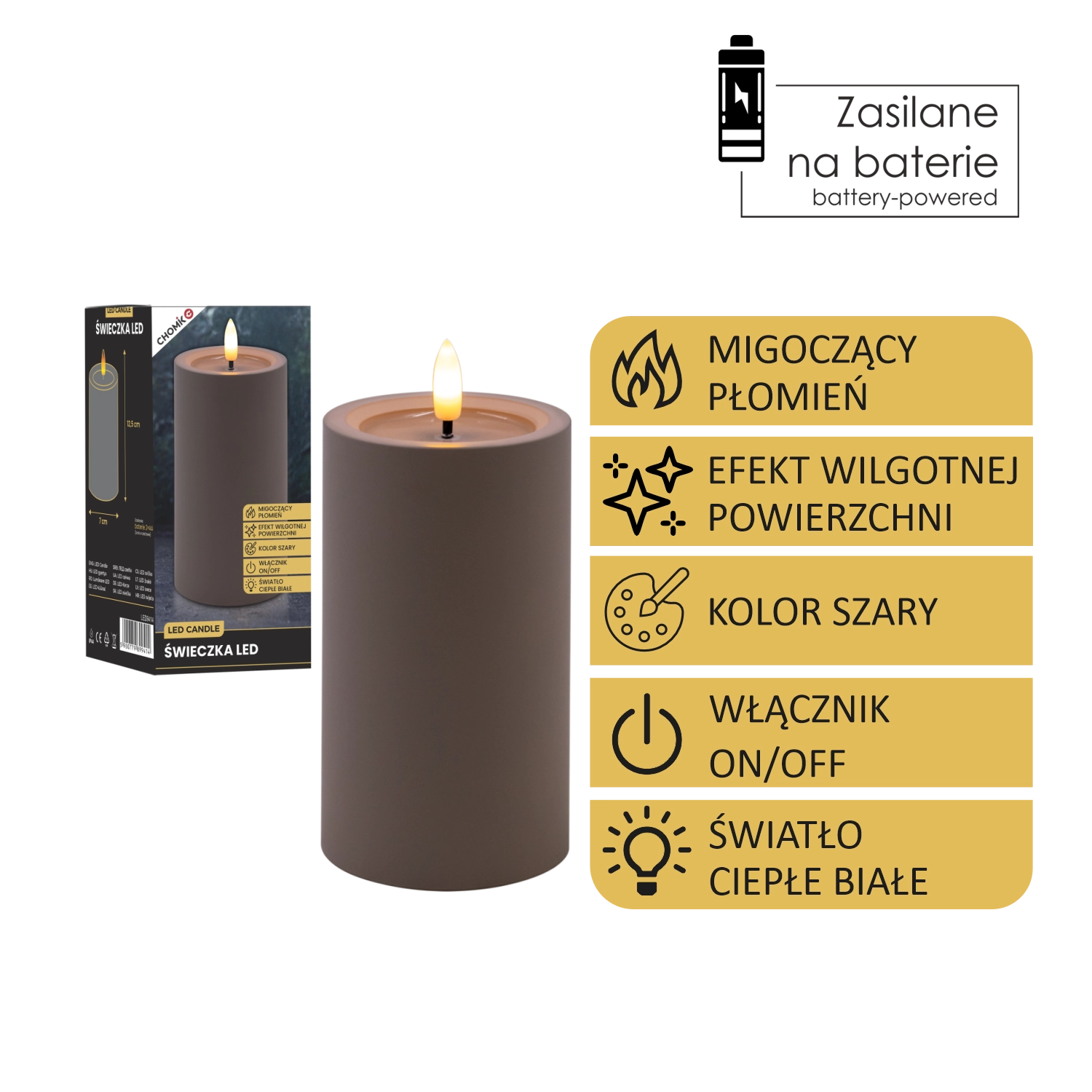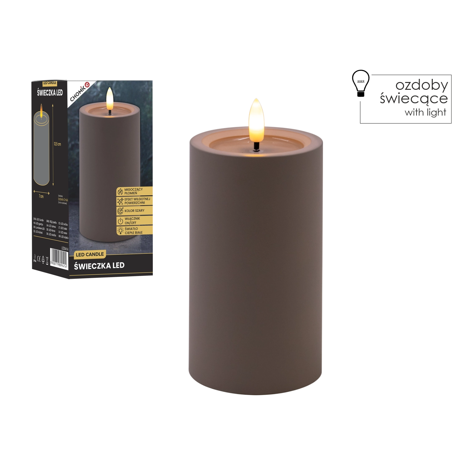 Elegantní šedá LED svíčka s realistickým, mihotavým plamenem v teplé bílé barvě a efektem vlhké horní hrany pro přirozený vzhled. Skvěle se hodí do interiéru, bezpečná alternativa ke klasické svíčce, napájená 2× AA bateriemi (nejsou součástí balení).