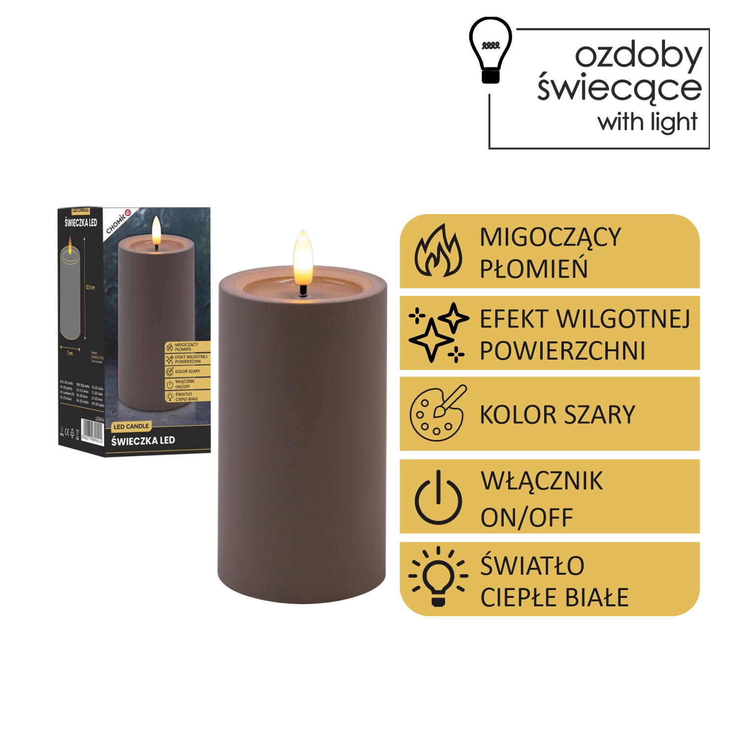 - Realistický vzhled: mihotavý plamen a efekt vlhké horní hrany