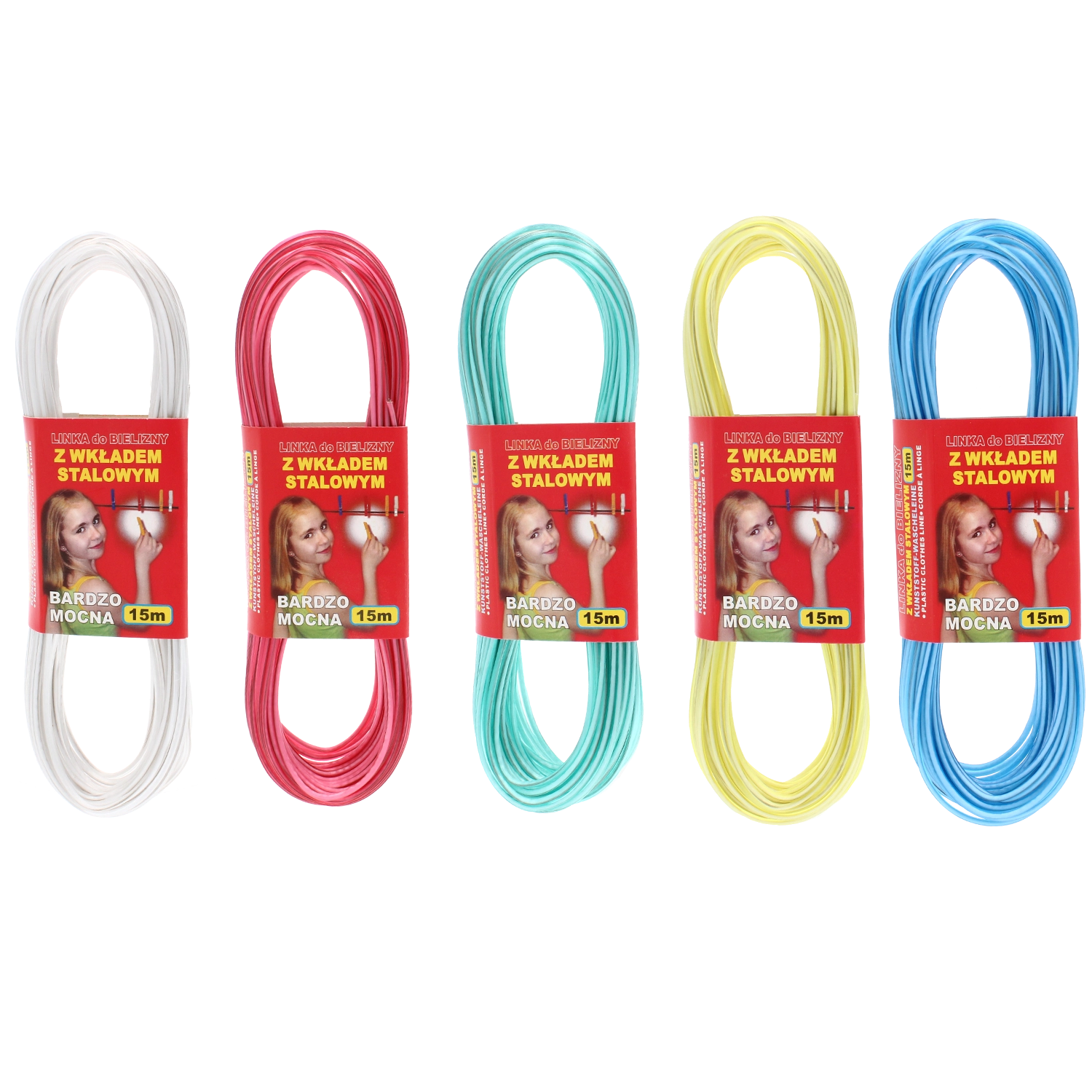 Praktická linka na prádlo o délce 15 m s ocelovým jádrem a PVC povrchem nabízí vysokou pevnost, dlouhou životnost a odolnost vůči povětrnostním vlivům. Vhodná pro vnitřní i venkovní použití, unese i těžší kusy prádla bez prověšení a pomáhá udržet prádlo čisté a nepoškozené během sušení.