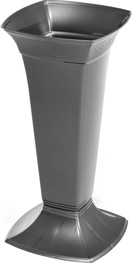 Elegantní hřbitovní flakon LAMELA Etna v barvě grafitová metalíza je stylová váza s řeckým ornamentem pro důstojnou dekoraci hrobů. Je vyroben z odolného plastu s ochranou proti UV záření a mrazu, takže nevybledá a dlouhodobě si zachová svůj vzhled. Stabilní tvar zajišťuje jisté uložení květin a snadnou údržbu.