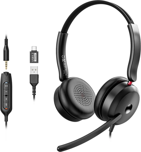 Praktický ovládací panel na kabelu umožňuje ovládat přehrávání, hlasitost a ztlumení mikrofonu, přičemž LED indikátor jasně ukazuje stav mikrofonu. Trojí připojení zajišťuje širokou kompatibilitu s PC, notebooky, konzolemi i dalšími zařízeními – přes USB‑C nebo klasický 3,5mm jack. Dlouhý kabel (cca 1,8–1,9 m) poskytne volnost pohybu u stolu.