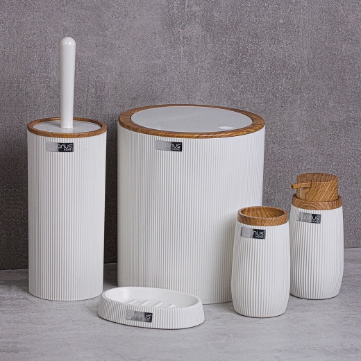 Stylová koupelnová sada o pěti dílech v bílé barvě s elegantními prvky imitace dřeva z odolného plastu pro každý den. Obsahuje vše potřebné pro organizovanou a hygienickou koupelnu: koš na odpadky, toaletní kartáč, dávkovač mýdla, pohárek na kartáčky a mýdlenku.