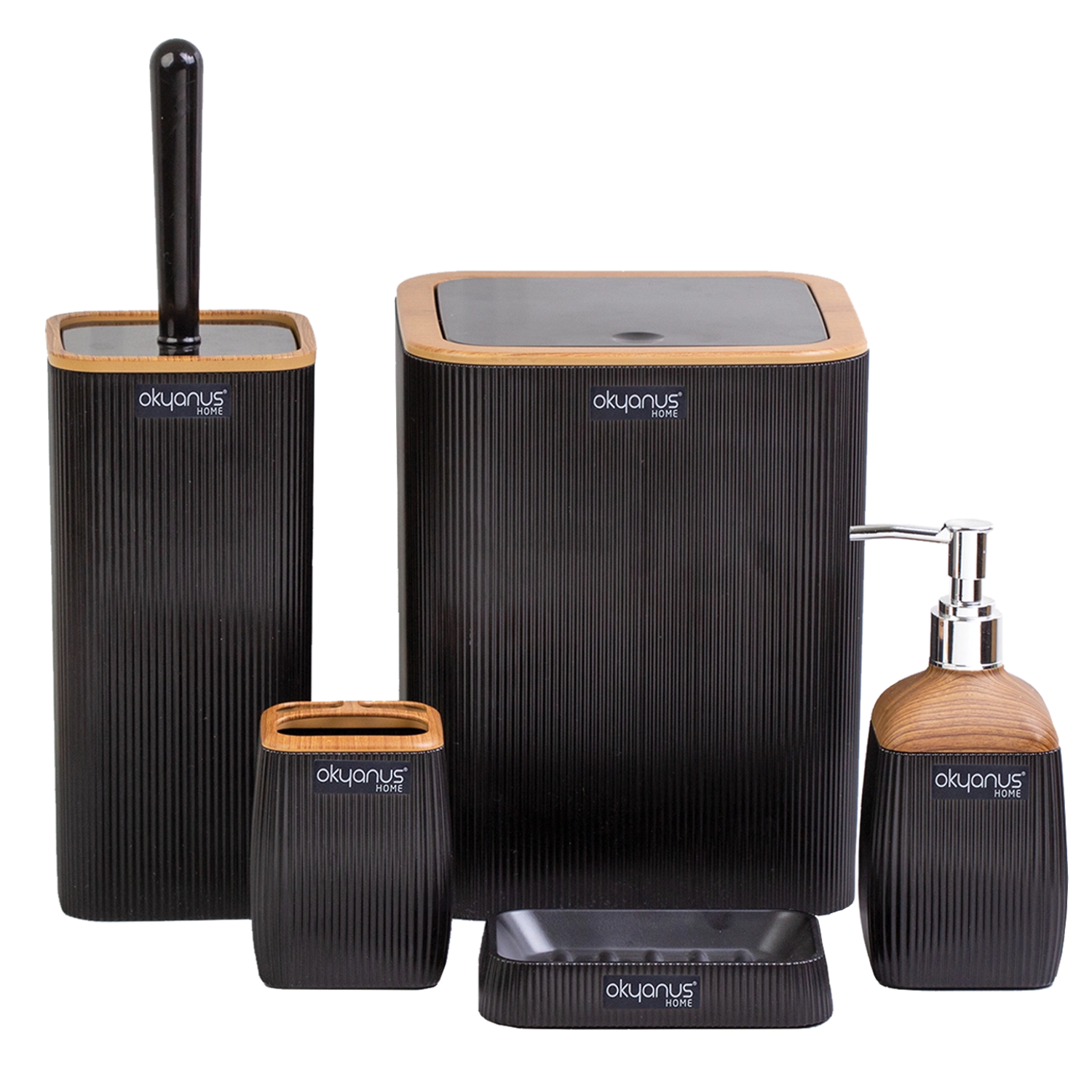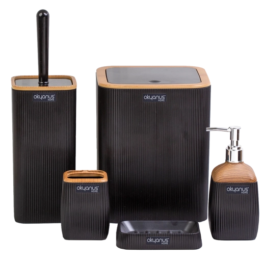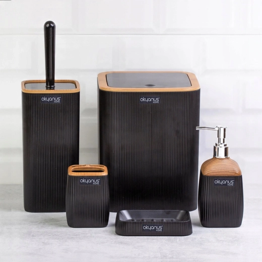 Stylová čtvercová koupelnová sada v elegantní černé barvě s dekorem dřeva přinese do vaší koupelny moderní vzhled a praktickou organizaci. Odpadkový koš, WC štětka, dávkovač mýdla, kelímek na kartáčky a mydelnička jsou vyrobeny z odolného plastu, který se snadno čistí a skvěle odolává vlhkosti.