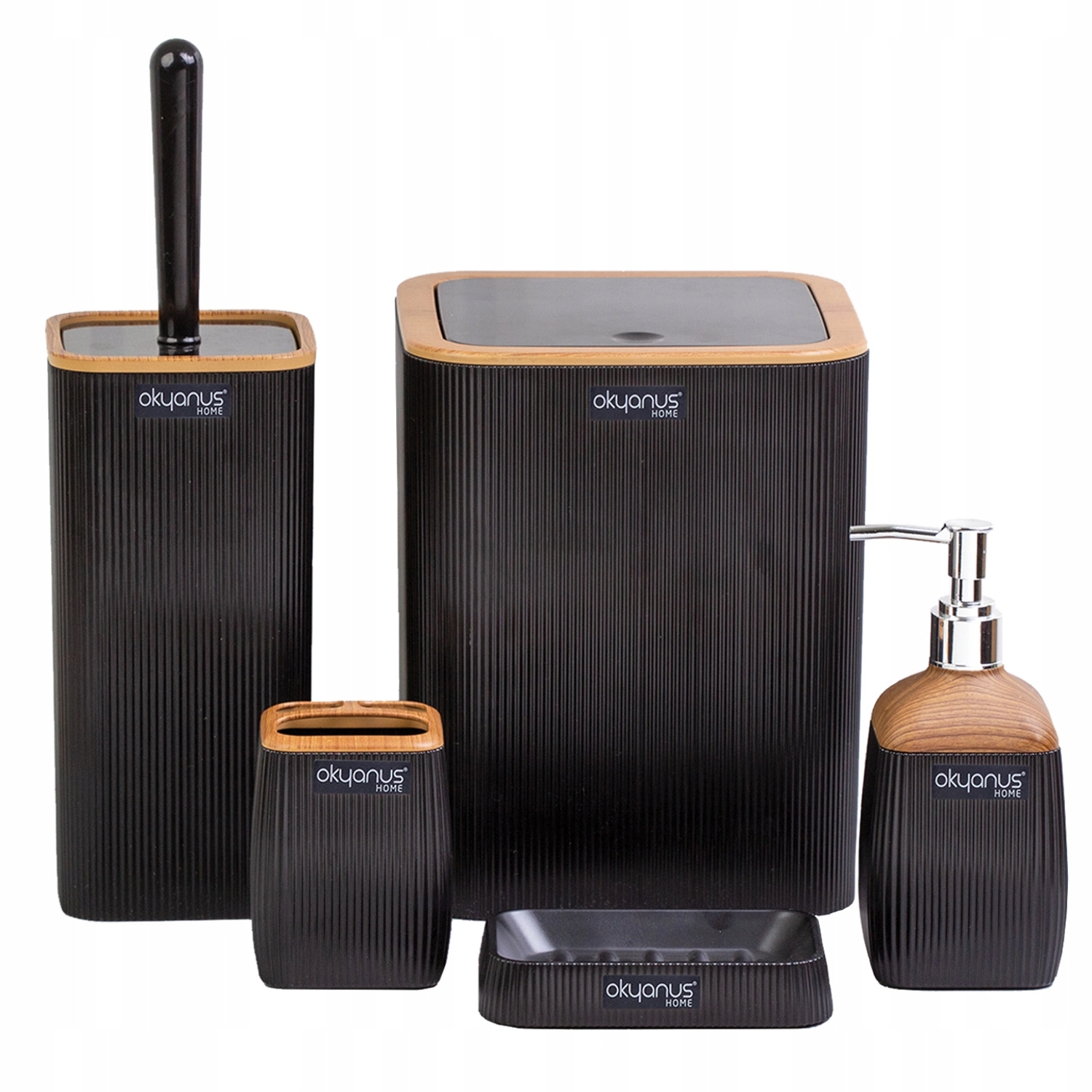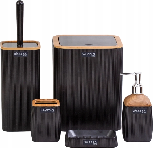 Tato 5dílná sada je ideální volbou pro každou koupelnu, kde hrají roli funkčnost, jednotný design a snadná údržba. Černé provedení s imitací dřeva dodává prostoru přírodní akcent a prémiový vzhled.