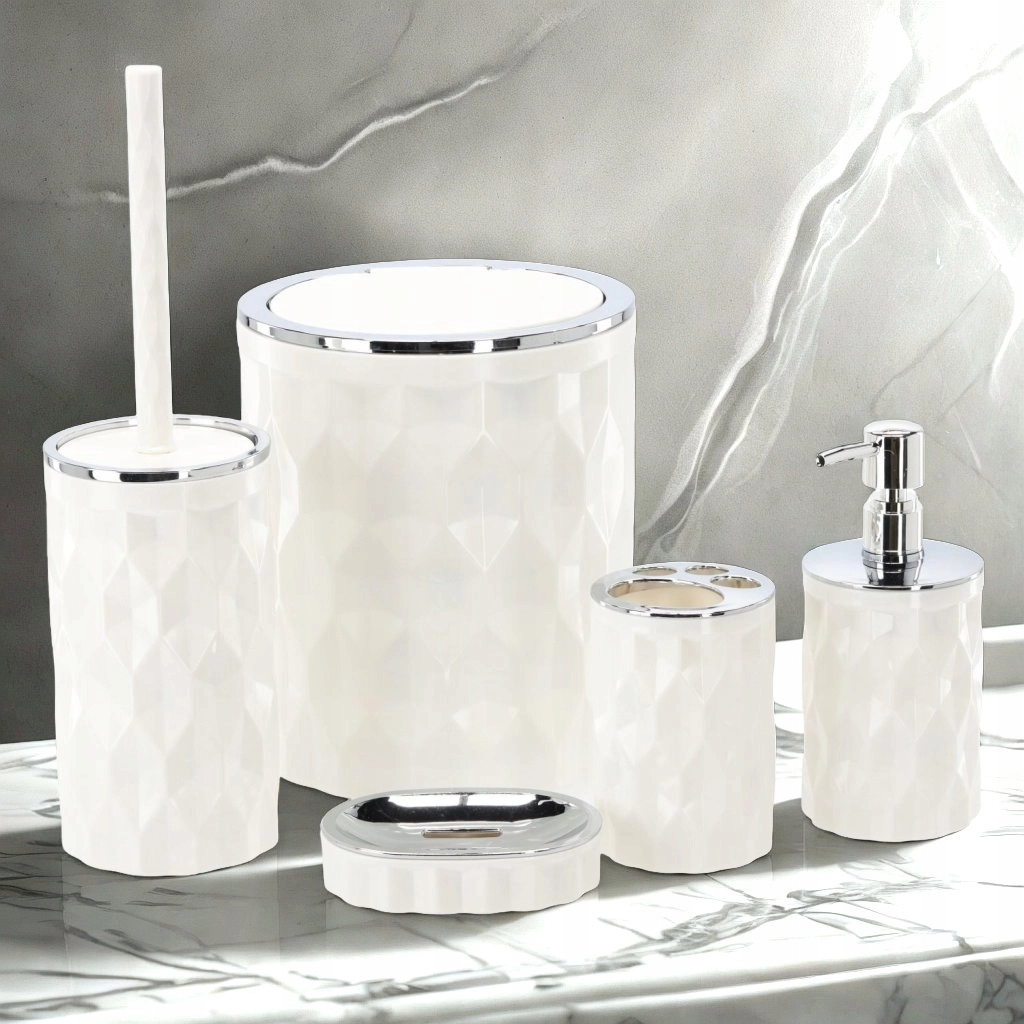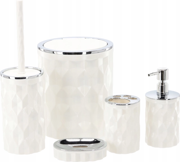 Stylová pětidílná sada koupelnových doplňků v elegantní bílé barvě přináší vše, co potřebujete pro každodenní hygienu a pořádek. Díky jednotnému designu s moderními detaily a praktickému rozložení prvků získáte čistý, sladěný vzhled koupelny i snadnou údržbu. Sada obsahuje koš na odpadky, držák se štětkou na WC, dávkovač na tekuté mýdlo, stojánek na zubní kartáčky a mýdlenku.
