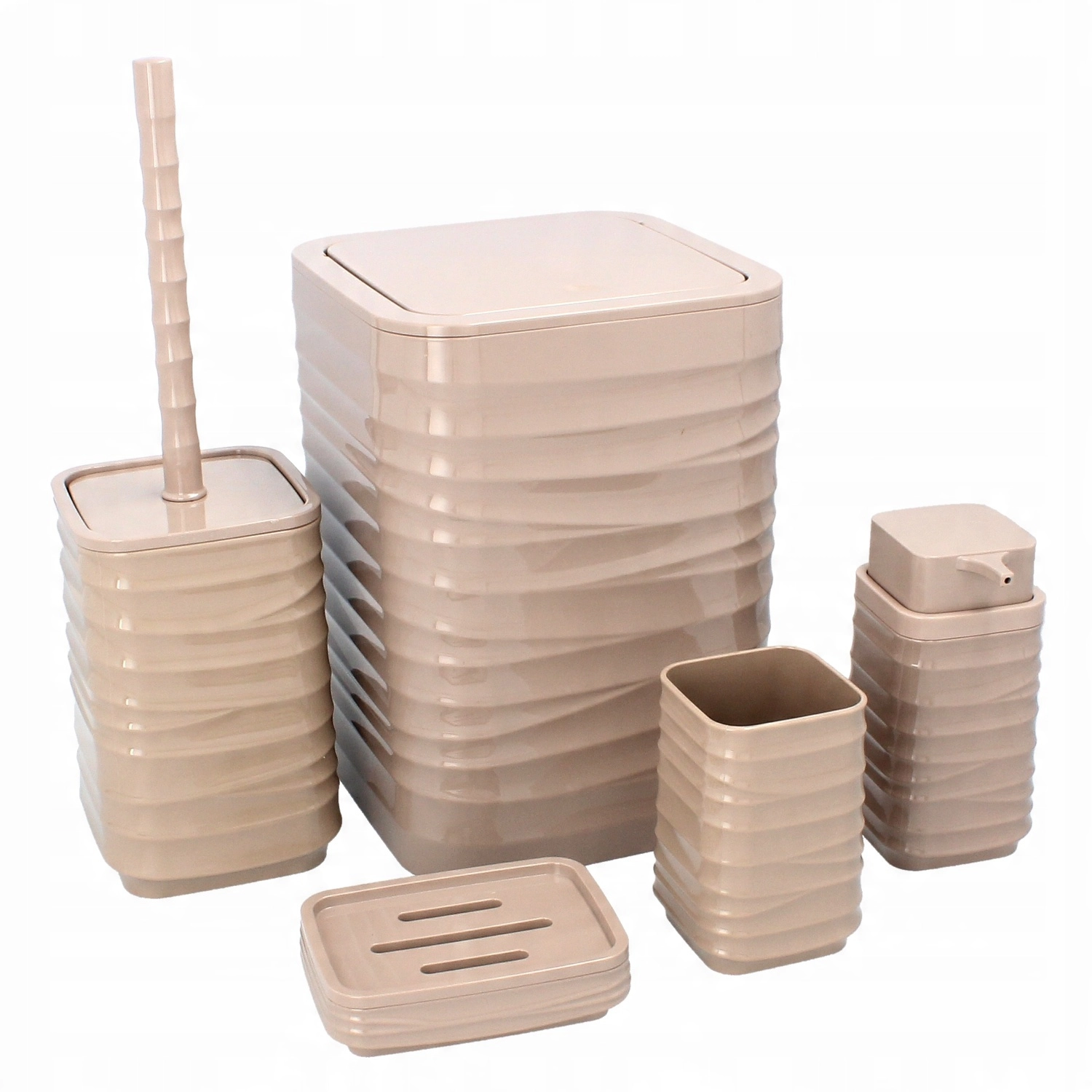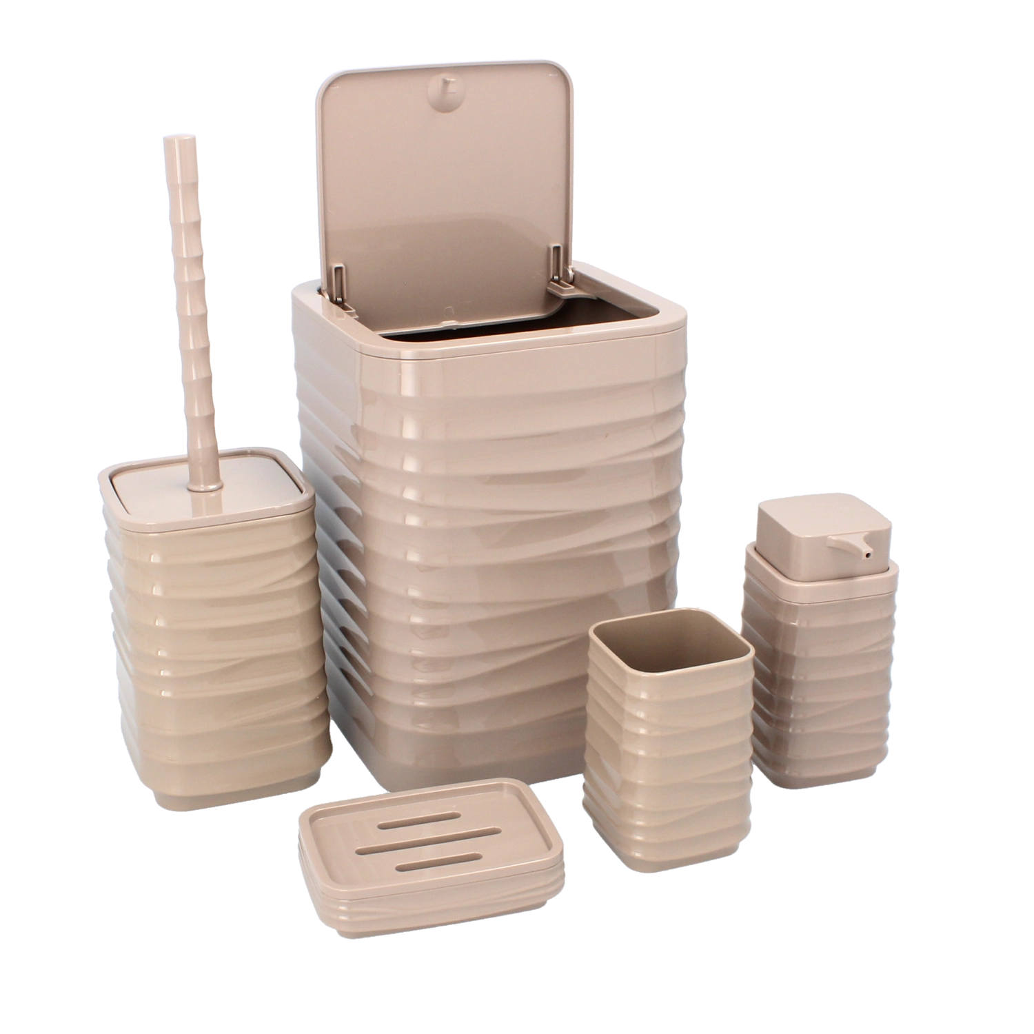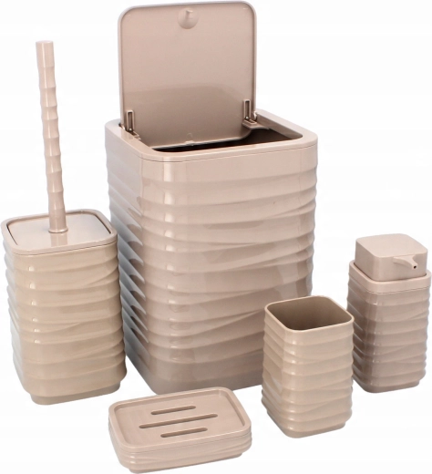 Stylová koupelnová sada z odolného plastu v elegantní hnědé barvě sjednotí vzhled celé koupelny. Obsahuje koš na odpadky, toaletní štětku s držákem, dávkovač mýdla, pohárek na kartáčky a mýdlenku. Praktický čtvercový design s rýhovanou strukturou šetří místo a snadno se udržuje.