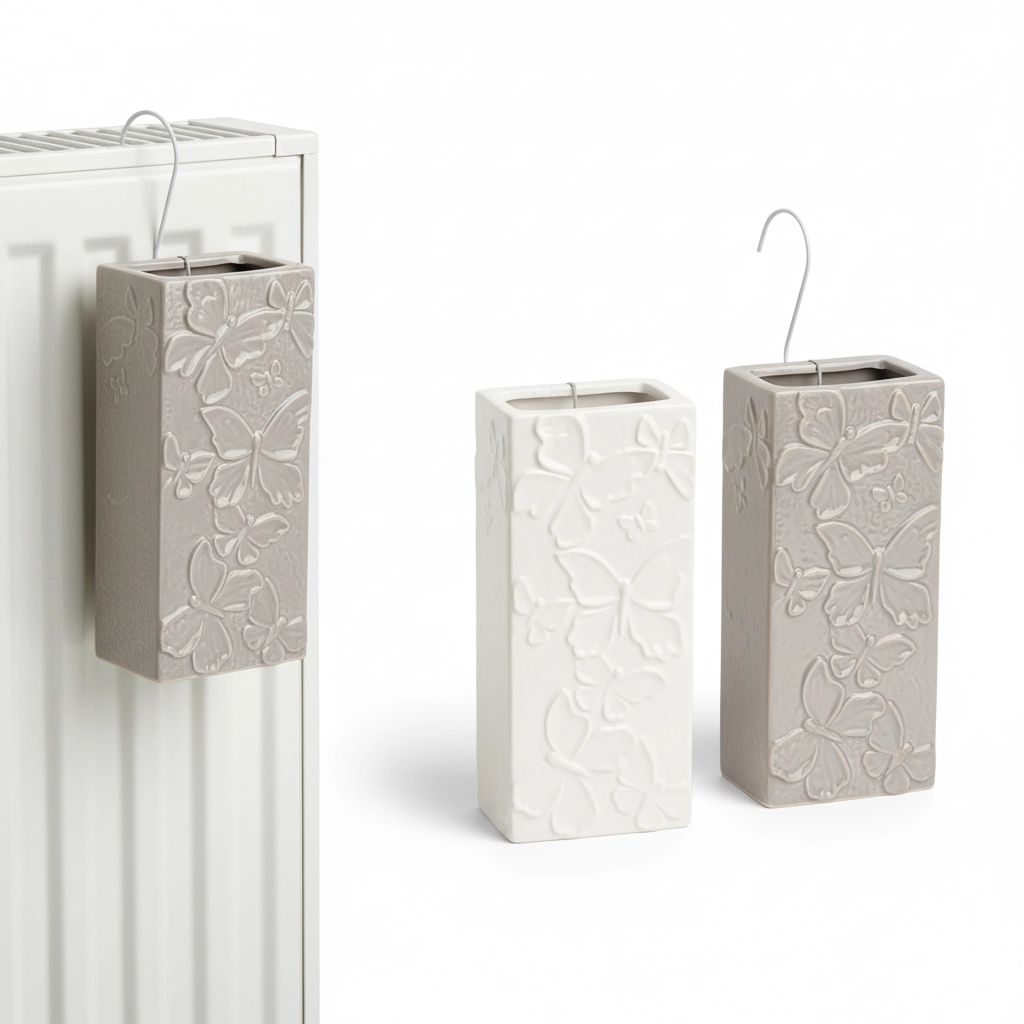 Vytvořte si doma příjemné klima s keramickými zvlhčovači na radiátor s jemným reliéfem motýlů. Stačí je naplnit vodou a zavěsit na topení – teplo zajistí pozvolné odpařování a přirozené zvlhčení vzduchu bez spotřeby elektřiny, filtrů či hluku. Set 6 kusů pokryje více místností v bytě nebo domě.