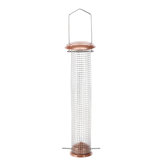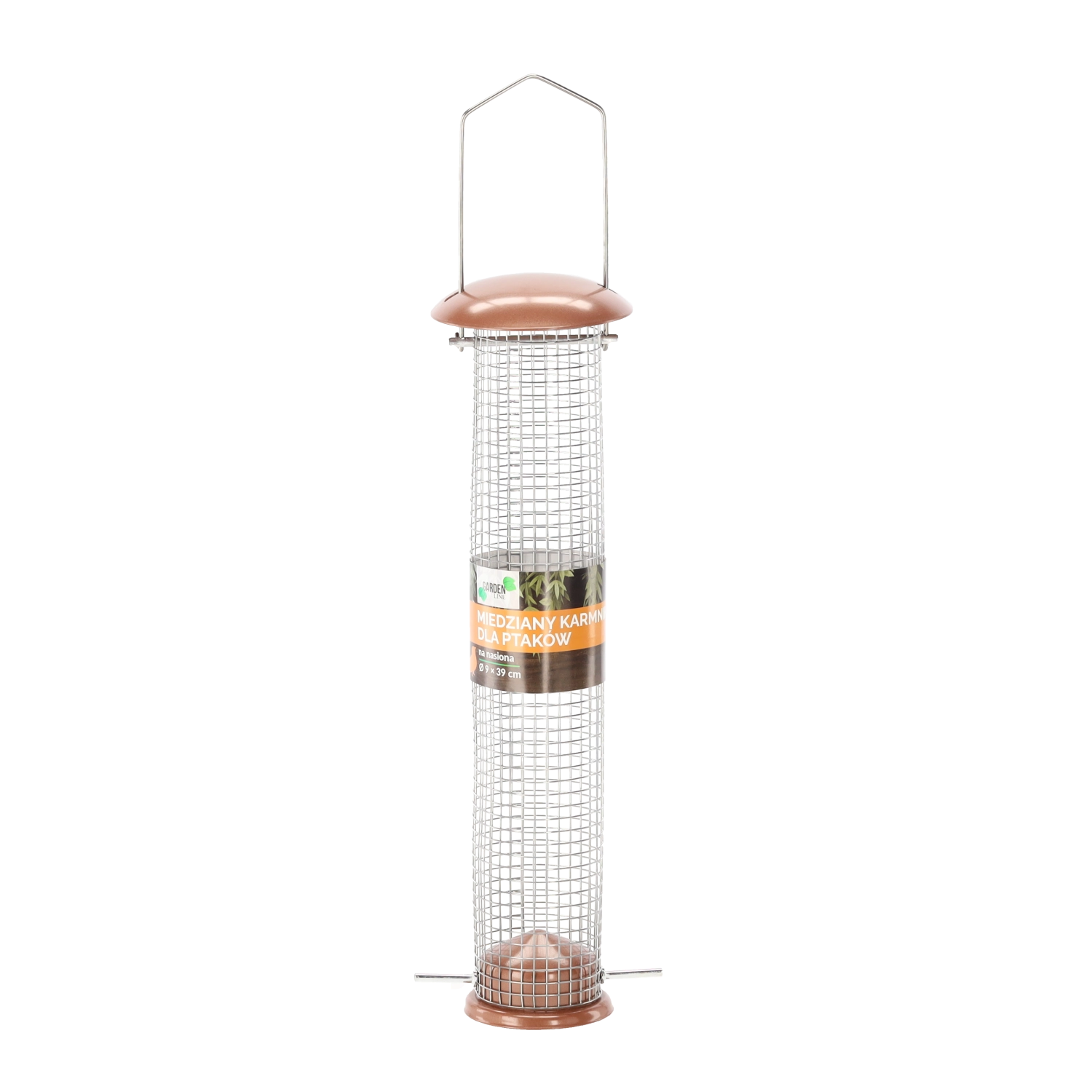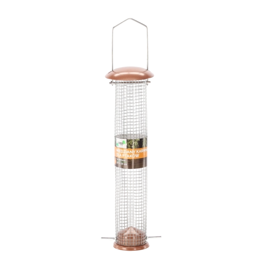 Stylové a odolné krmítko pro ptáky v podobě tubusu z kovu a drátěné sítě v elegantní barvě mědi. Ideální pro zavěšení na zahradě či balkóně a pravidelné doplňování semen. Díky praktickému závěsu je instalace snadná a rychlá, zatímco pevná kovová konstrukce a efektní měděné provedení zajišťují dlouhou životnost i atraktivní vzhled.
